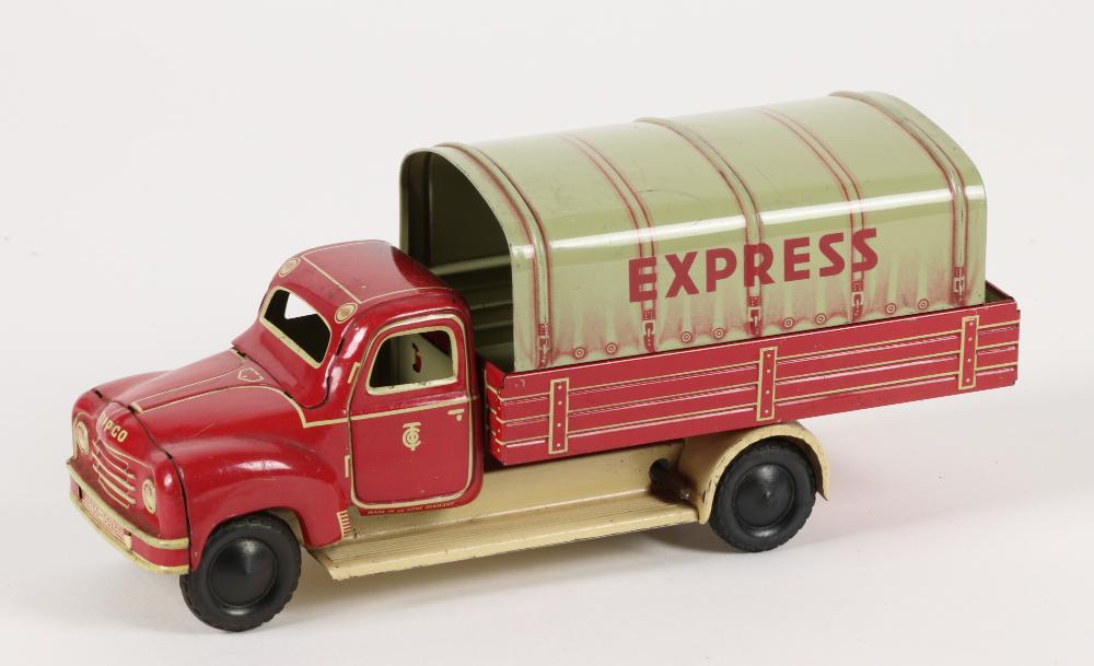 Hanomag Express Lastwagen, aus Blech mit Uhrwerkantrieb, das Verdeck der Ladeläche ist abnehmbar.