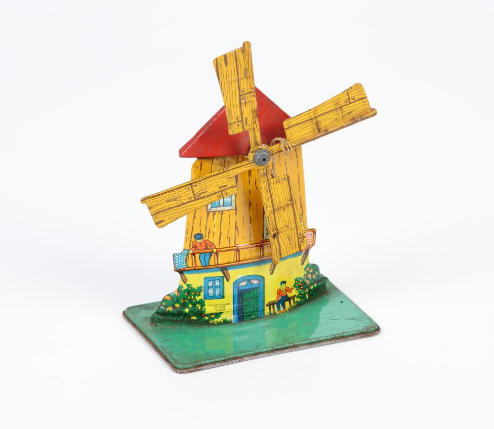 Bunt chromlitografiert Windmühle mit den Abbildungen vom (Müller und seiner Frau, die geprägten Blechflügel drehen sich im Betrieb duch einen Transmissions-Anschluß auf der Rückseite