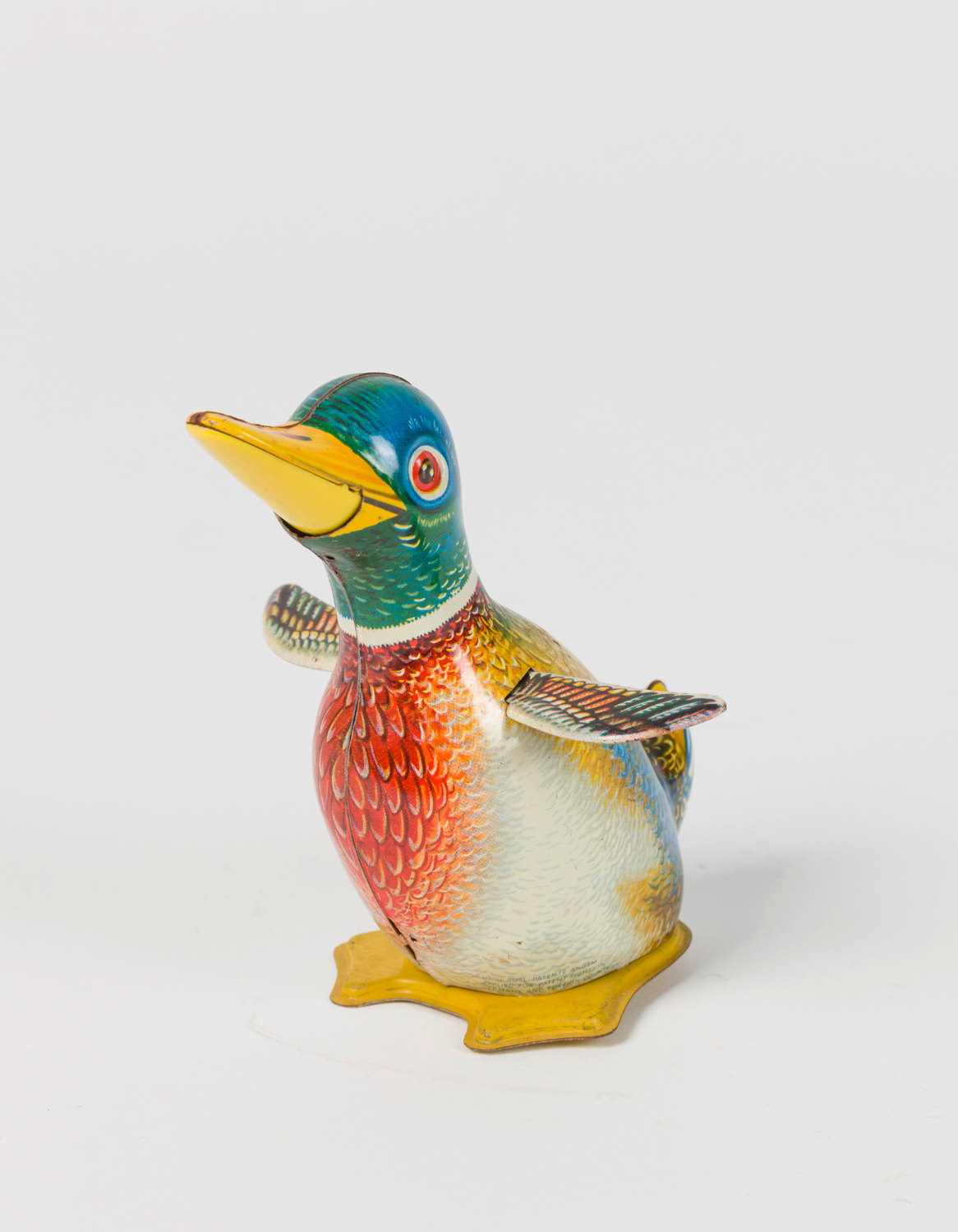 Schreiende Ente mit Uhrwerksantrieb, aufgezogen watschelt sie vorwärts, bleibt stehen, schlägt mit den Flügeln, schreit und watschelt weiter