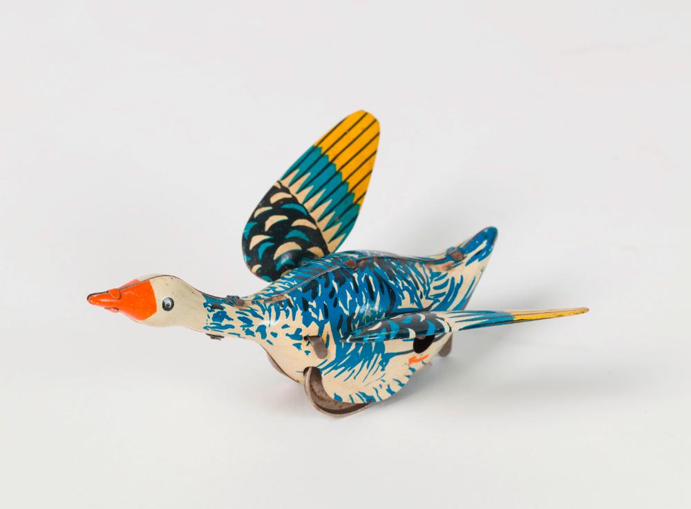 Ente mit Uhrwerksantrieb, aufgezogen bewegt sie sich watschelnd vorwärts, während die Flügel auf und ab schwingen