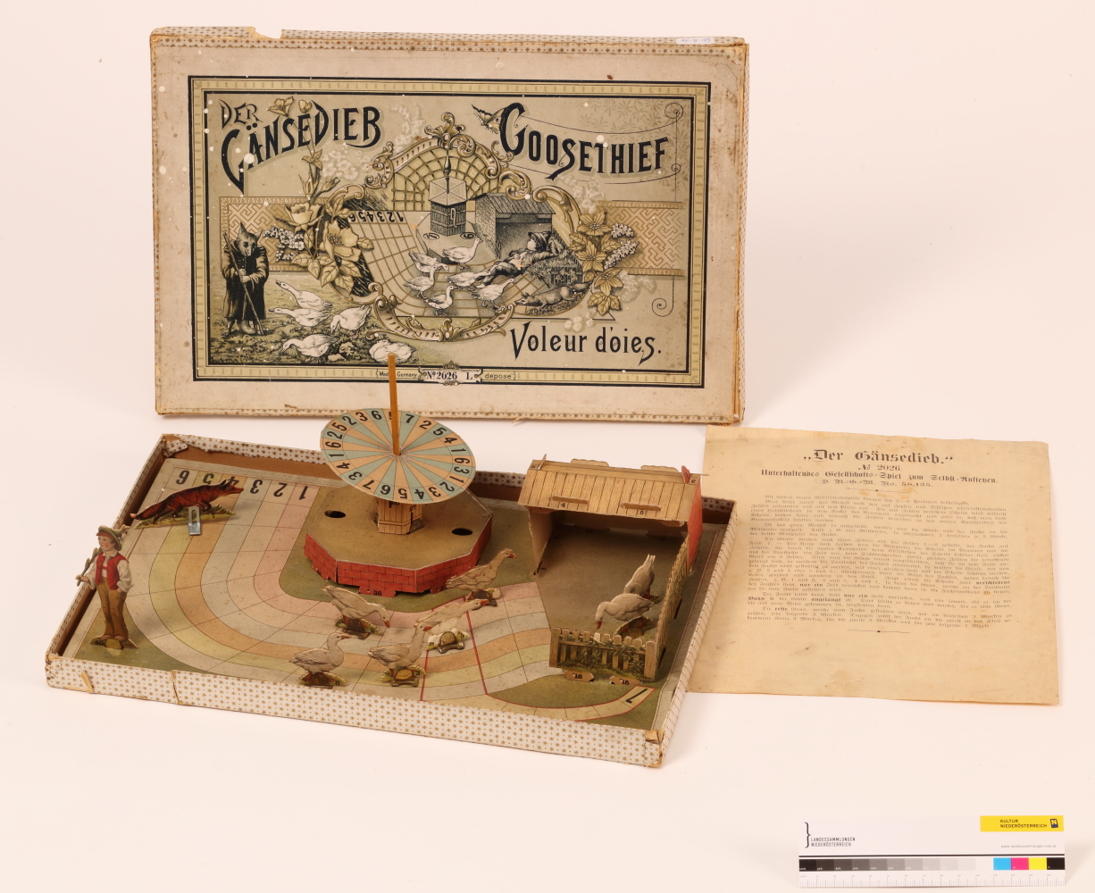 Brettspiel „Der Gänsedieb“, Originalverpackung und Beschreibung