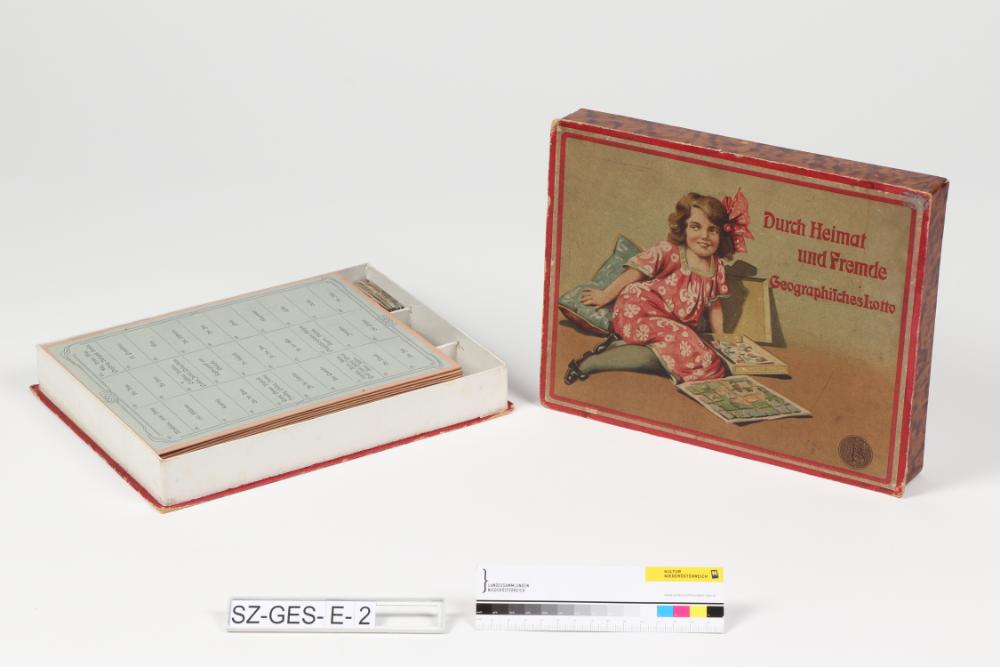 Brettspiel „Durch Heimat und Fremde, Geographisches Lotto“, Originalverpackung, 19. Jahrhundert.