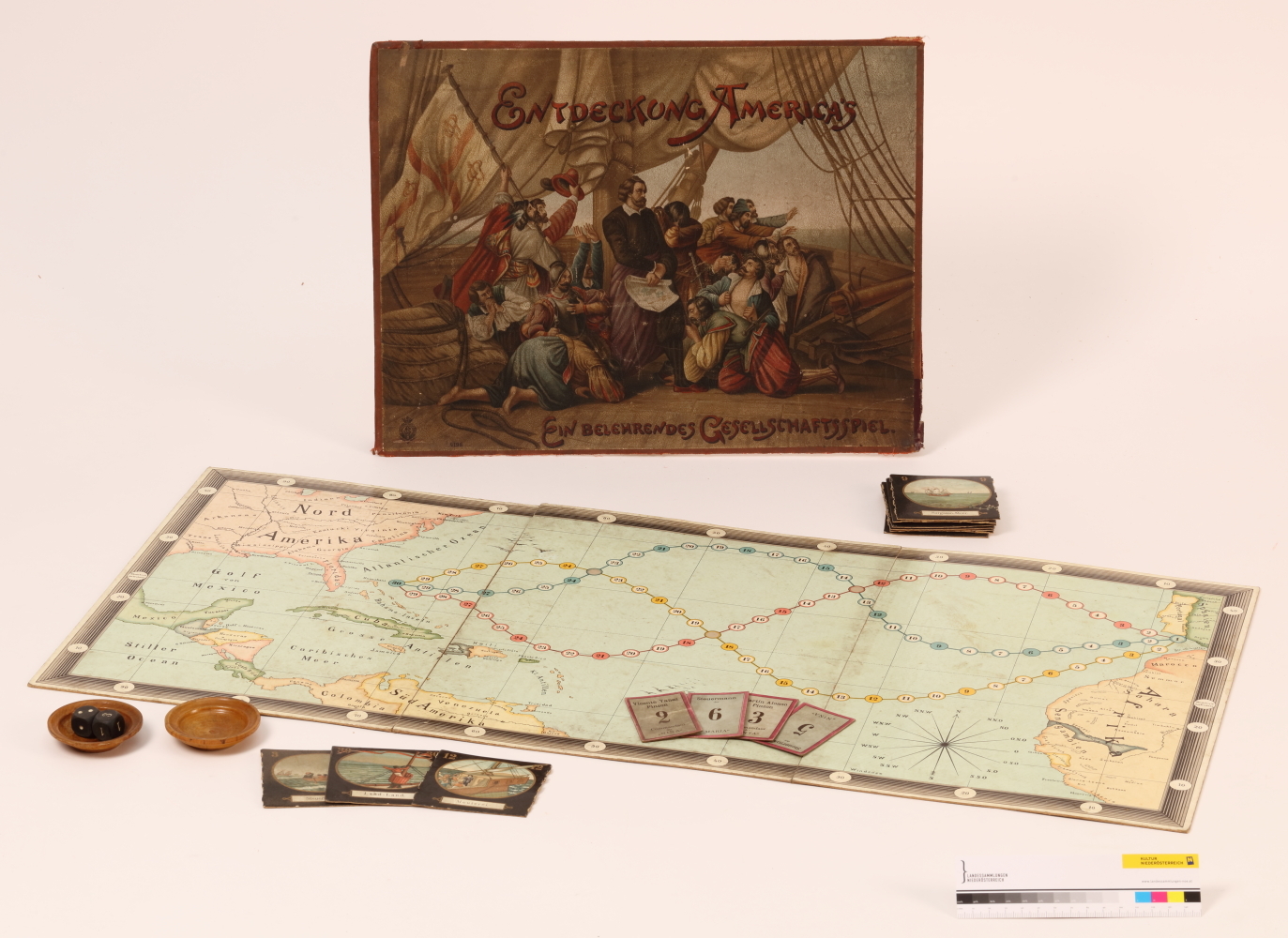 Brettspiel „Entdeckung Americas, ein belehrendes Gesellschaftsspiel“, Originalverpackung