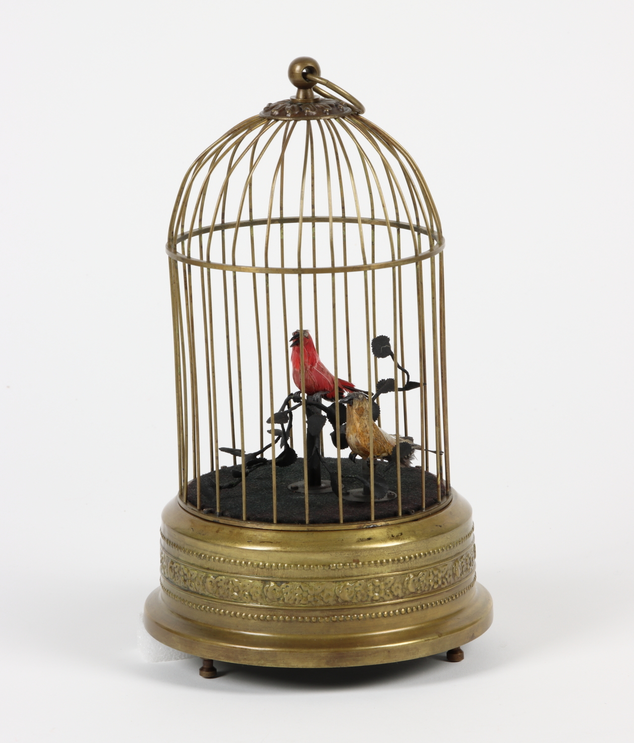 Singvogelautomat mit 2 beweglichen und singenden Vögeln mit echten Federn im Käfig, Fa. Karl Griesbaum, Triberg im Schwarzwald, Made in Germany
