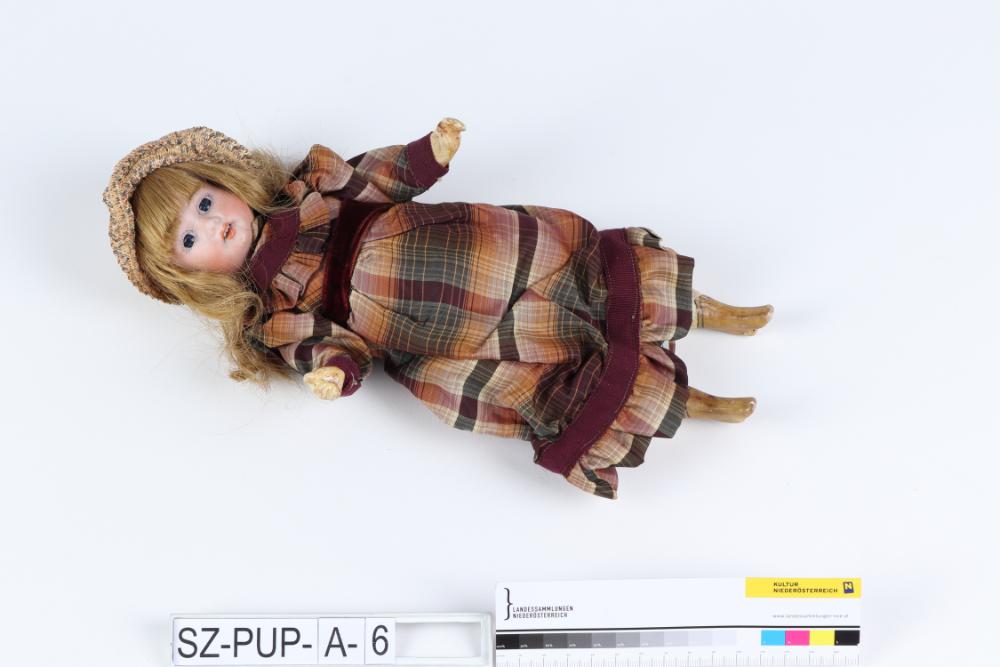 Porzellanpuppe der Fa. Haubach aus Köppelsdorf in Thüringen (seit 1887), mit ausdrucksstarkem, handbemaltem Kopf, blondem Haar und geöffnetem Mund und gemalten Zähnen.
