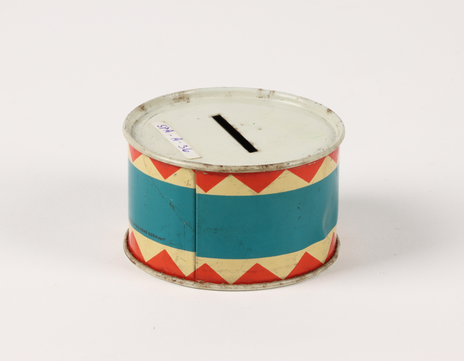 Spardose/Sparbüchse in Form einer Trommel, Made in US Zone Germany