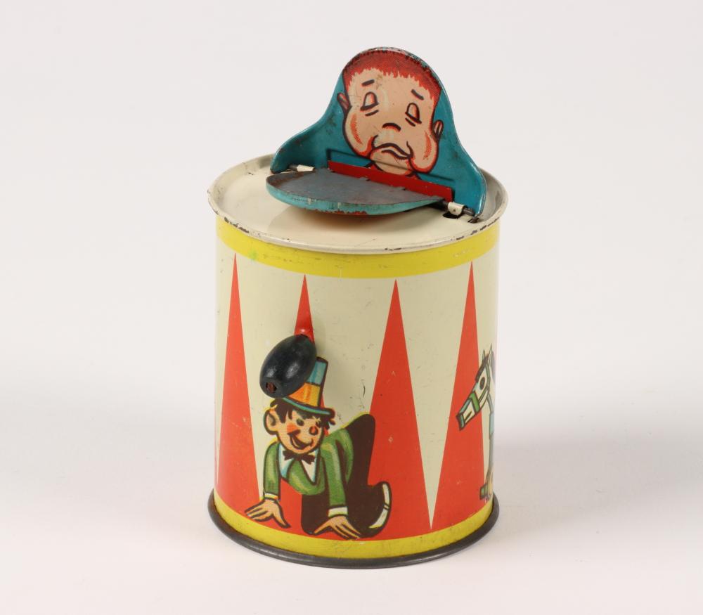 Spardose/Sparbüchse in Form einer Trommel mit Zirkusmotiven, mit aufgesetztem Gesicht, Made in Western Germany