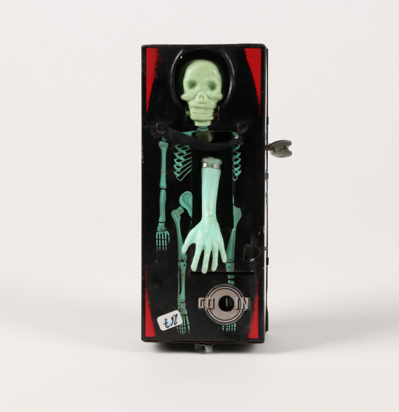 Durch das Einlegen einer Münze wird das aufziehbare Federwerk aktiviert und die Skeletthand schnappt sich die Münze und schiebt diese in den Sarg hinein.