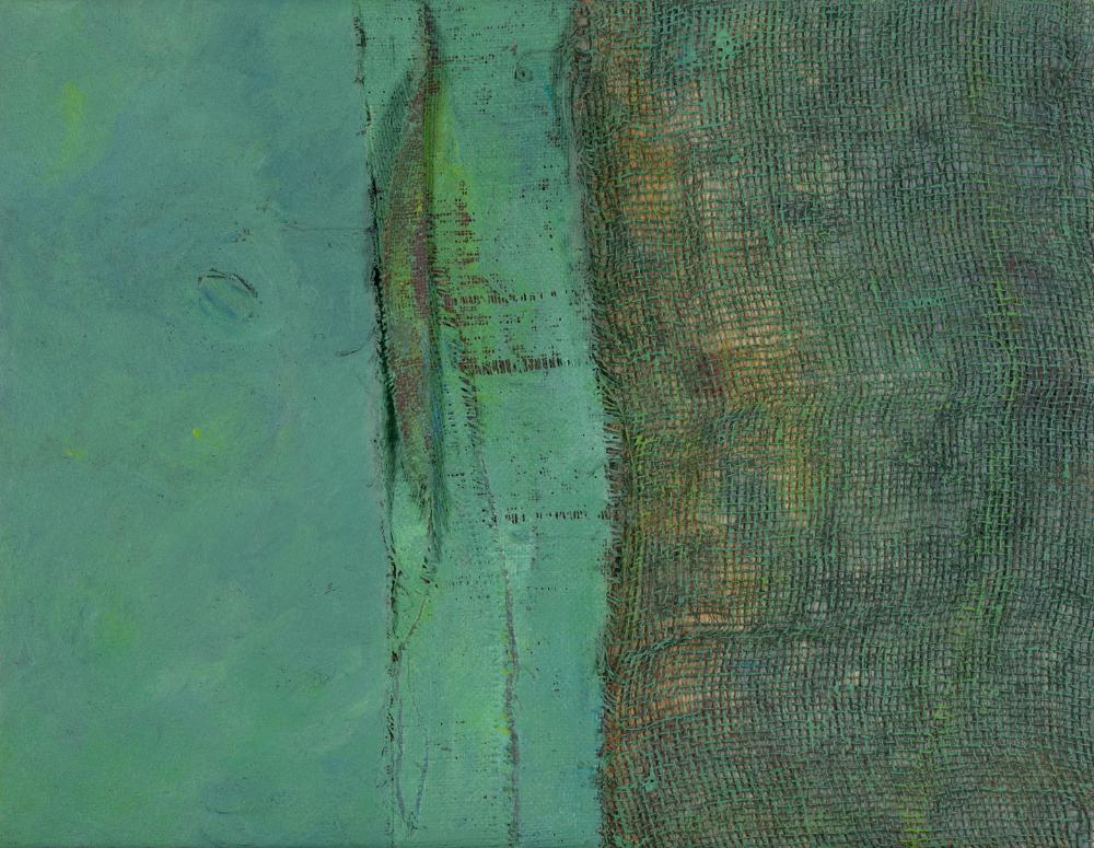 Mehrere Schichten Jute und Baumwolle wurden hier über die bemalte Leinwand gespannt, in der unteren Hälfte wurden dabei die Fäden herausgezogen, sodass der Untergrund durchscheint. Die Ränder des Gewebes geben - man achte auf den Titel! - abstrahierte Wellen des Meeres vor, ein umgeklappter Rand ähnelt strukturell einer sich überschlagenden Welle. Die oberste Linie hat die Funktion des Horizonts, Meer und Himmel verschwimmen buchstäblich durch die Farbgebung. Durch diese - im Bild tatsächlich vorhandene - Räumlichkeit vermittelt uns "Maritima" eine fließende Bewegung.