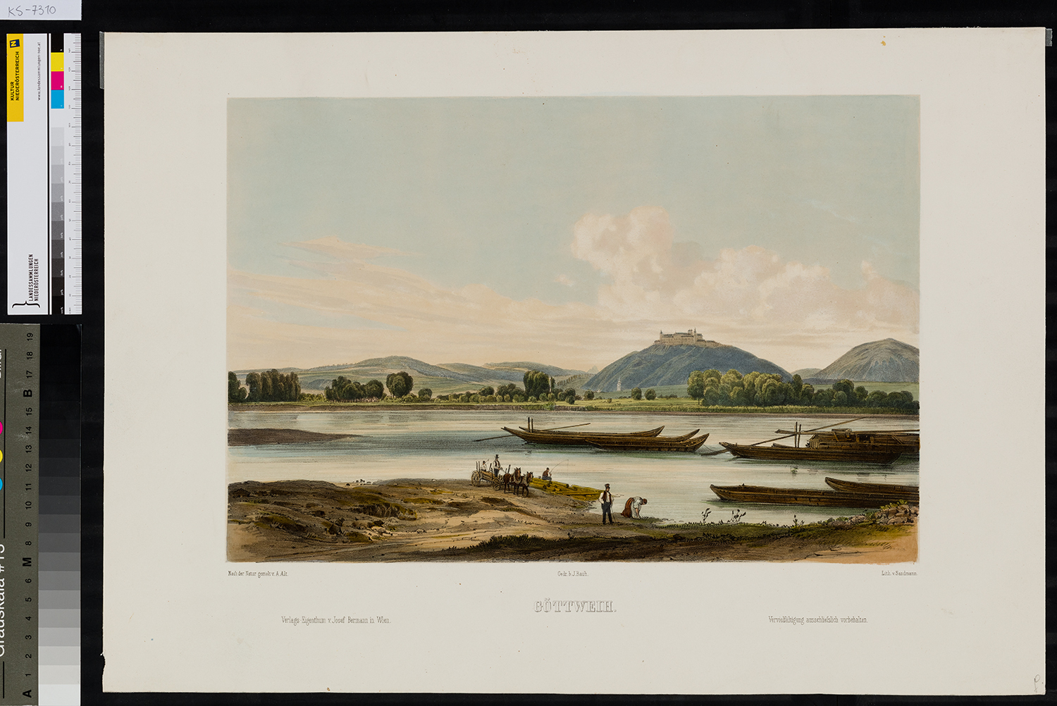 Signaturli. unten (unter dem Motiv, in der Platte) bez. und sign.: "Nach der Natur gezeichnet v. A. (sic!) Alt.", Mi. unten (unter dem Motiv, in der Platte) bez.: "Gedr. b. J. Rauh.", re. unten (unter dem Motiv, in der Platte) sign. "Lith. v. Sandmann.", li unten (in der Platte) bez.: "Verlags-Eigenthum v. Josef Bermann in Wien.", Mi. unten (in der Platte) bez.: "GÖTTWEIH.", re. unten (in der Platte) bez.: "Vervielfältigung ausschliesslich vorbehalten."