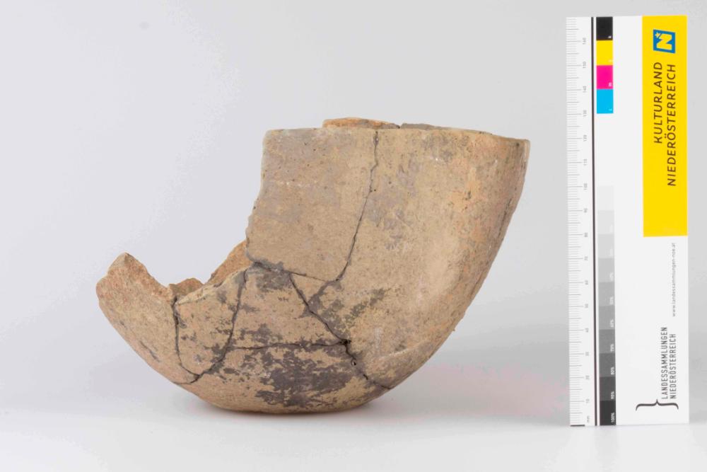 Die Schüssel ist zu ca. 2/3 erhalten und besitzt eine steinchen- und vegetabilienhaltige Magerung. Die dunkelgraue Oberfläche ist stark korrodiert und versintert, zeigt aber an den Stellen wo sie erhalten ist eine gute Glättung.