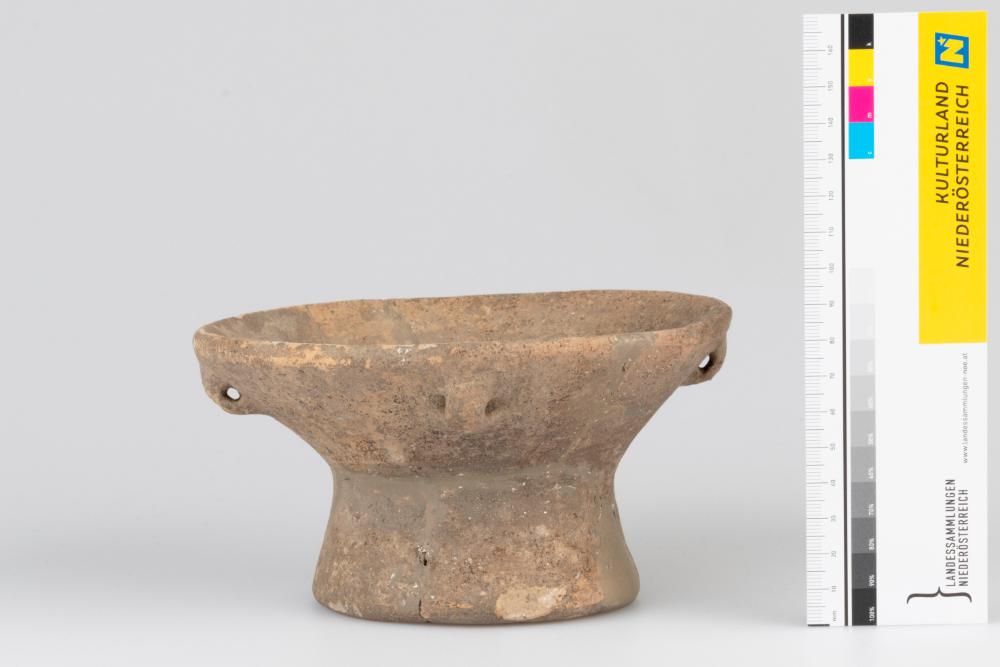 Die Fußschüssel zeichnet sich durch einen konisch geformten Gefäßkörper sowie einen ebenfalls konisch geformten Fuß aus. Die Gefäßkörper ist mit vier knapp unterrandständigen englichtigen Bandhenkeln versehen, in einer kreuzständigen Anordnung. Es handelt sich um einen Mischbrand aus feinem Ton mit weicher Scherbenhärte, dessen Farbe ein hellbraunes bis bräunliches Hellgrau zeigt. Das Innere der Schale zeigt ein gräulich helles Braun. Das Gefäß ist mäßig bis gering verwittert, wobei die Oberfläche im Inneren leicht verändert ist. Am äußeren Rand ist eine starke Glättung zu erkennen. Die Schüssel wurde auf eine andere ähnliche Gefäß gestellt, in dem Leichenbrand aufbewahrt wurden. Infolgedessen wurde sie als Urne verwendet.