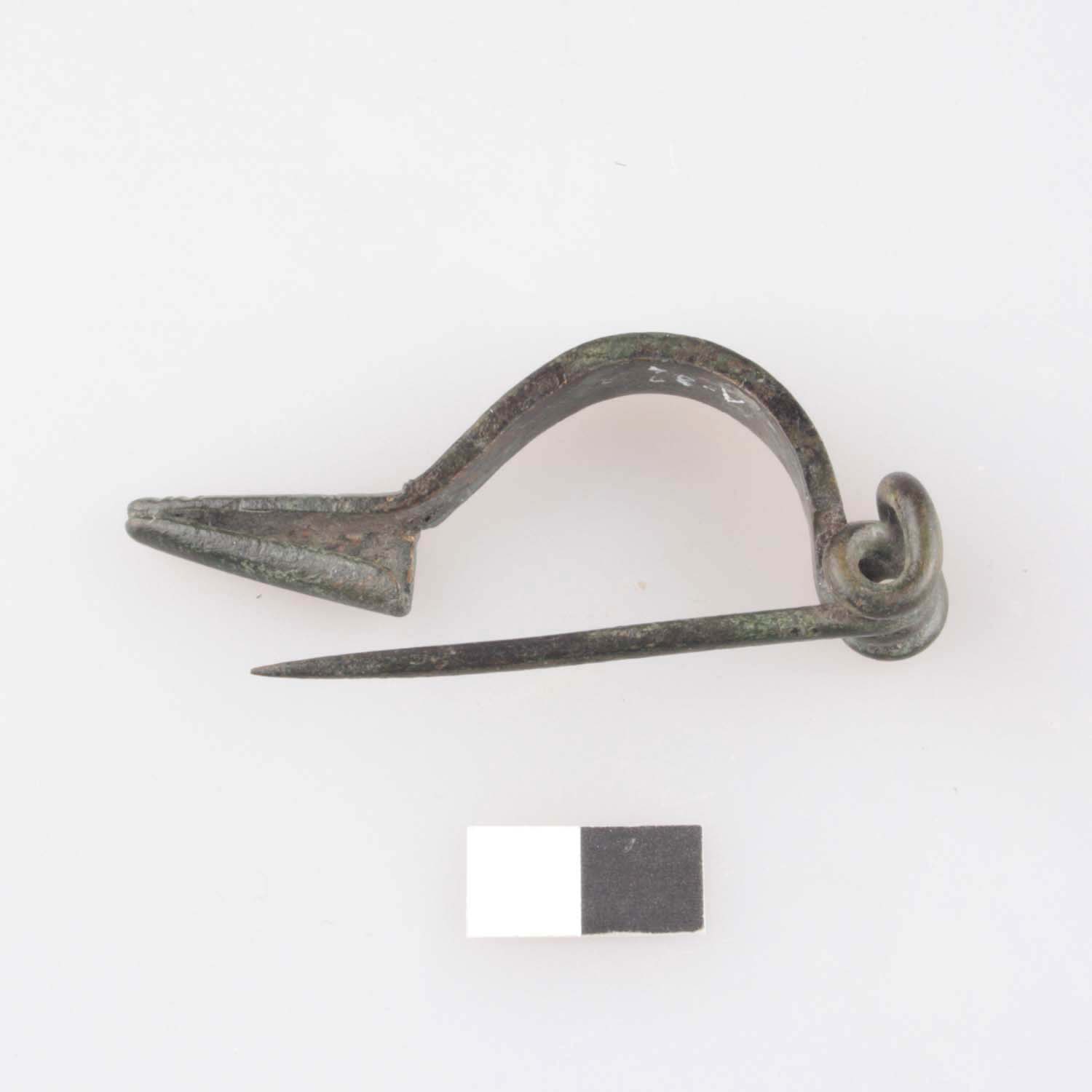 Eingliedrige Fibel mit spitzzulaufendem Fuß. Bandförmiger, im Querschnitt rechteckiger Bügel mit randbegleitenden Rillen. Gratförmiger Fuß durch mit Rille versehenem Quersteg vom Bügel getrennt, an der Oberseite mit drei, dreieckig zueinander stehenden Querrillen und am Ende mit kerben und Querrillen verziert. Vierwindige Spirsle und obere Sehne.
