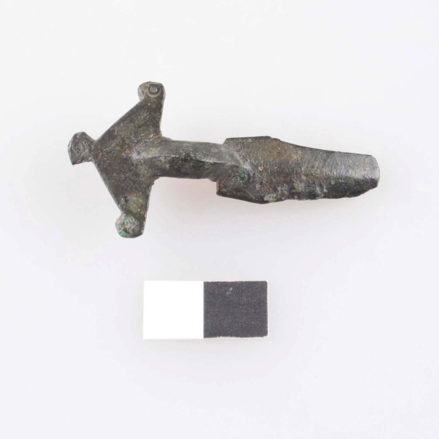 Bügelfibel, Buntmetall, mit dreieckiger Kopfplatte und leicht rhombischer Fußplatte mit Mittelgrat, Kopfplatte mit drei scheibenförmigen, kreispunktverzietrten Fortsätzen; größte Fußbreite liegt unterhalb der Fußmitte, eingezogene Fußränder, Spirale und Nadel fehlen.