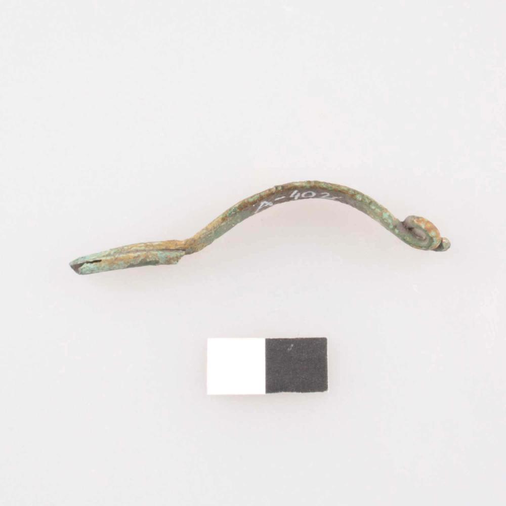 Eingliedrige Fibel, Buntmetall, mit schmäler werdendem Fuß und bandförmigem, mit Ritzlinie verziertem Bügel; Spiralkonstruktion und Nadel fehlen.