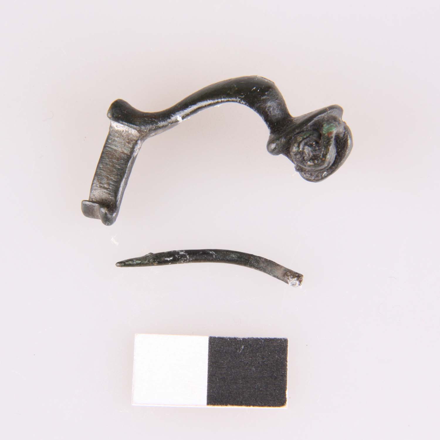 Zweigliedrige Kniefibel mit halbrunder, unverzierter Kopfplatte, Nadel abgebrochen und beiliegend