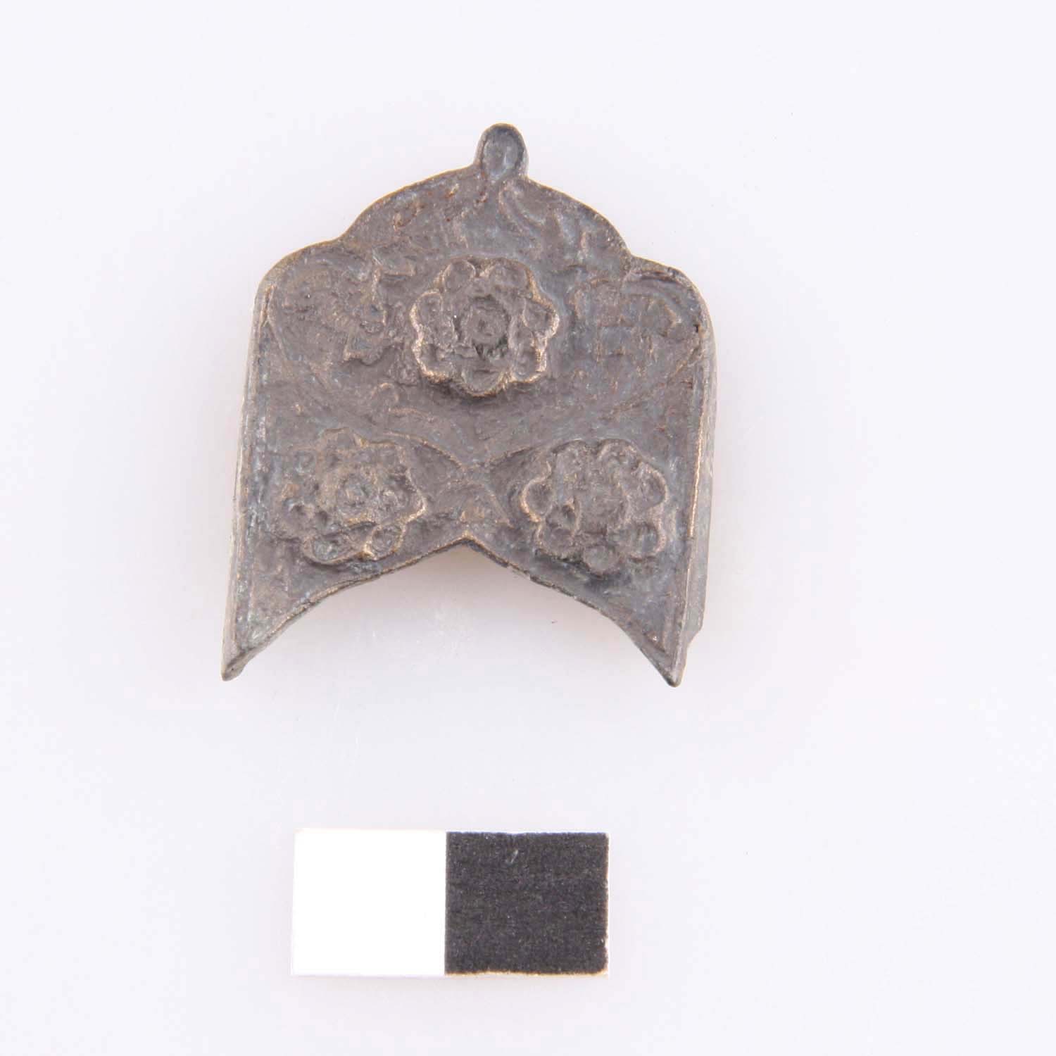 Wappenförmige Riemenzunge mit floraler Zier und Rankendekor