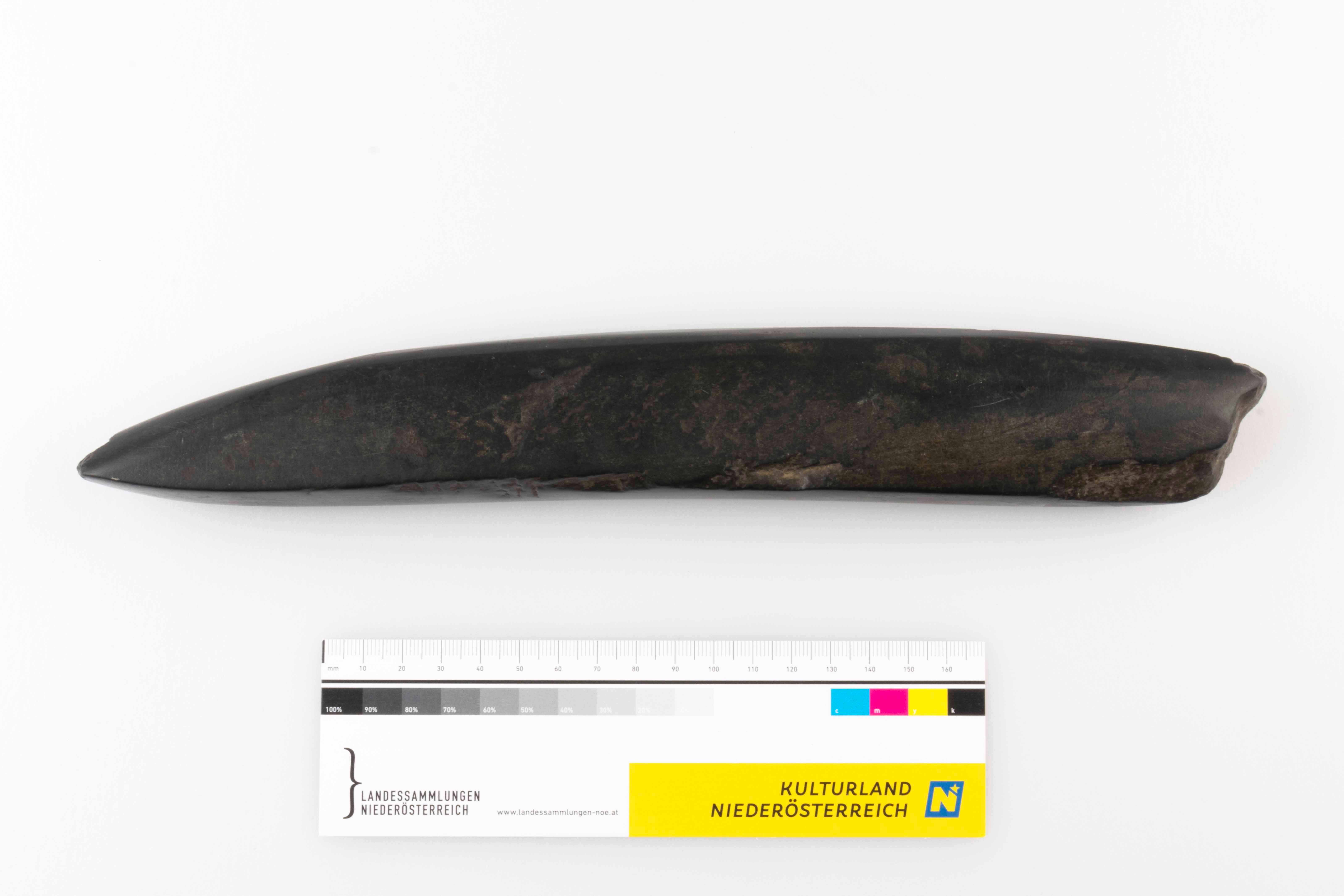 Hoher Schuhleistenkeil mit D-förmigem Querschnitt. Die Unterseite ist flach, während die Oberseite stark gewölbt ist. Der Nacken sowie die Schneide weisen Absplitterungen uaf. Die Oberfläche ist facettiert und zeigt einen politurähnlichen Glanz.