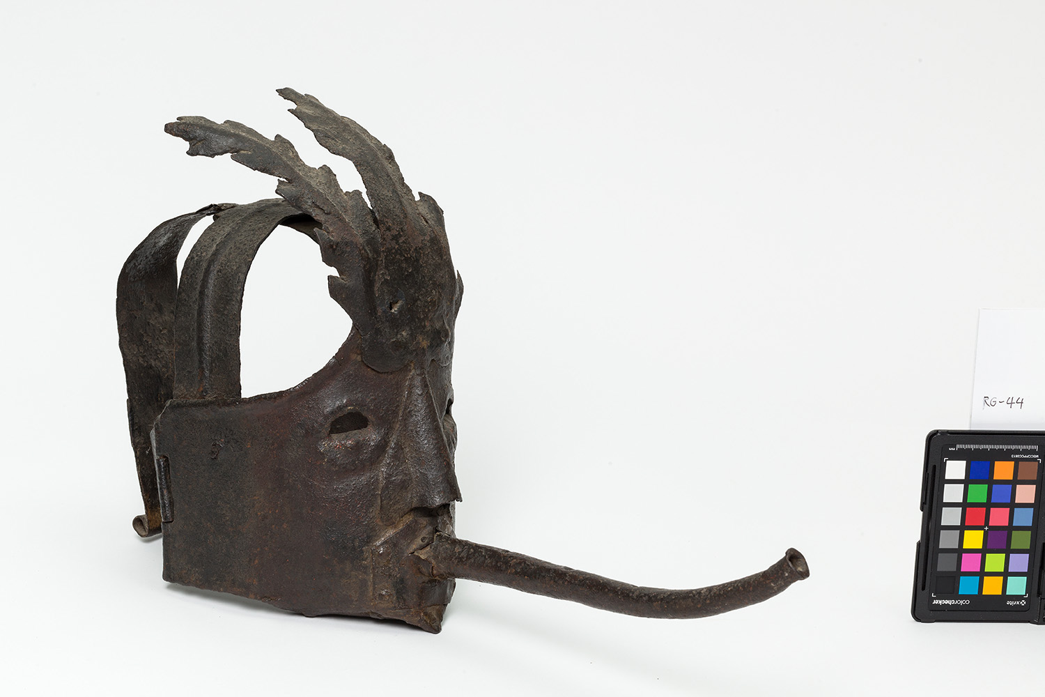 Schandmaske mit langem Rüssel. Mit Resten von roter und weißer Bemalung. Rüssel 27 cm lang mit fünf Löchern. Die Maske besteht aus drei Spangen, die rückwärts zusammengehalten sind.