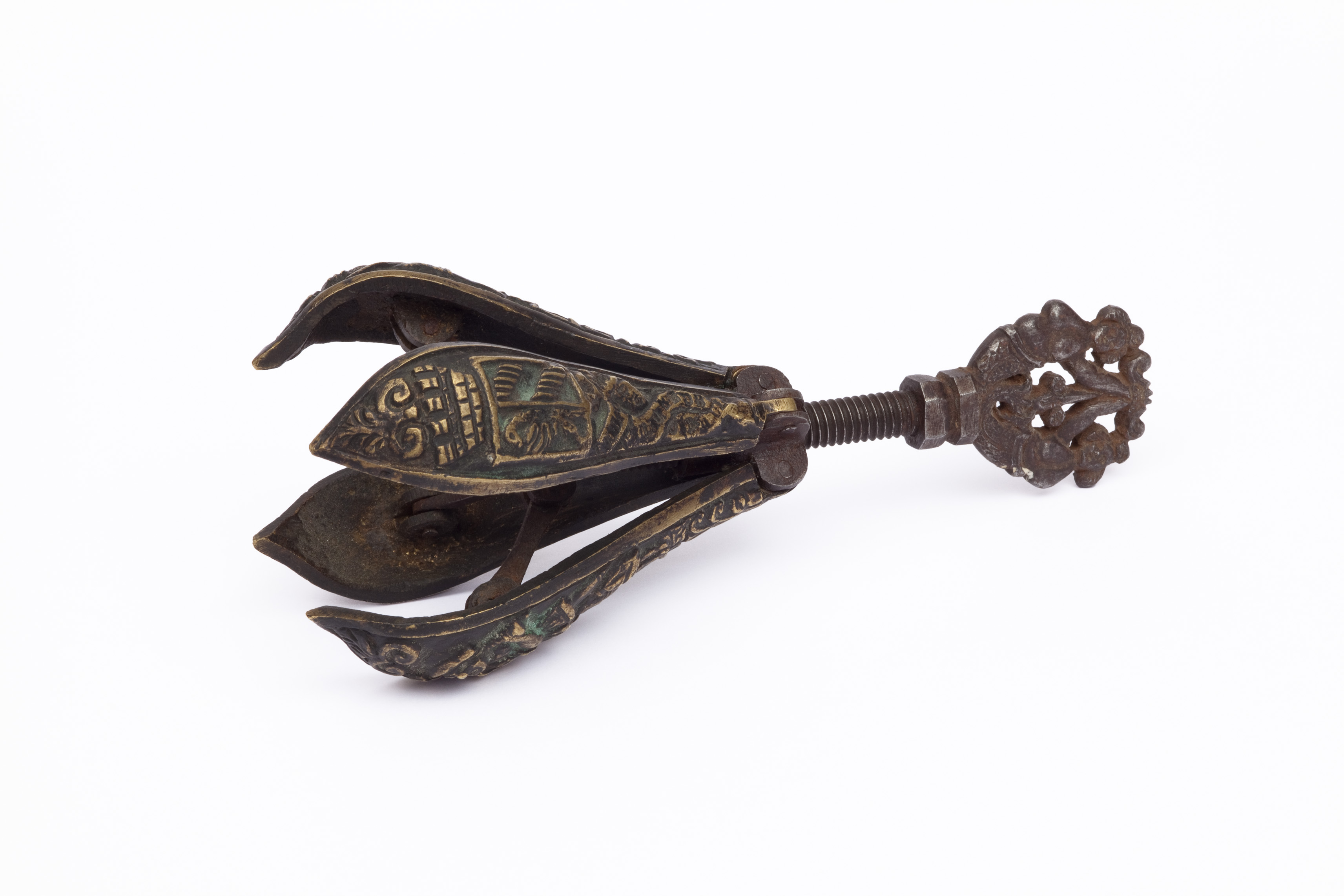 Die Flügel sind aus einer Kupferlegierung gegossen. Die Oberfläche ist nicht ziseliert und die stark ausgeprägte Patina künstlich aufgebracht. Die Abbildungen auf der Mundbirne zeigen möglicherweise zwei Scharfrichter, eine Justitiadarstellung sowie das Nürnberger Wappen mit Schriftband. Die Schraube besteht aus Stahl, vermutlich geschmiedet. Der Knauf in Gestalt zweier Meerjungfrauen ist fein gearbeitet.