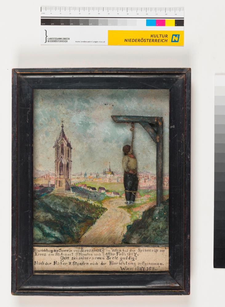 Unterhalb der Darstellung die Inschrift Hinrichtung des severin von Jaroszynski in Wien bei der Spinnerin am Kreuz am 30. August drei Minuten nach 1/2 9 Uhr Früh 1827.