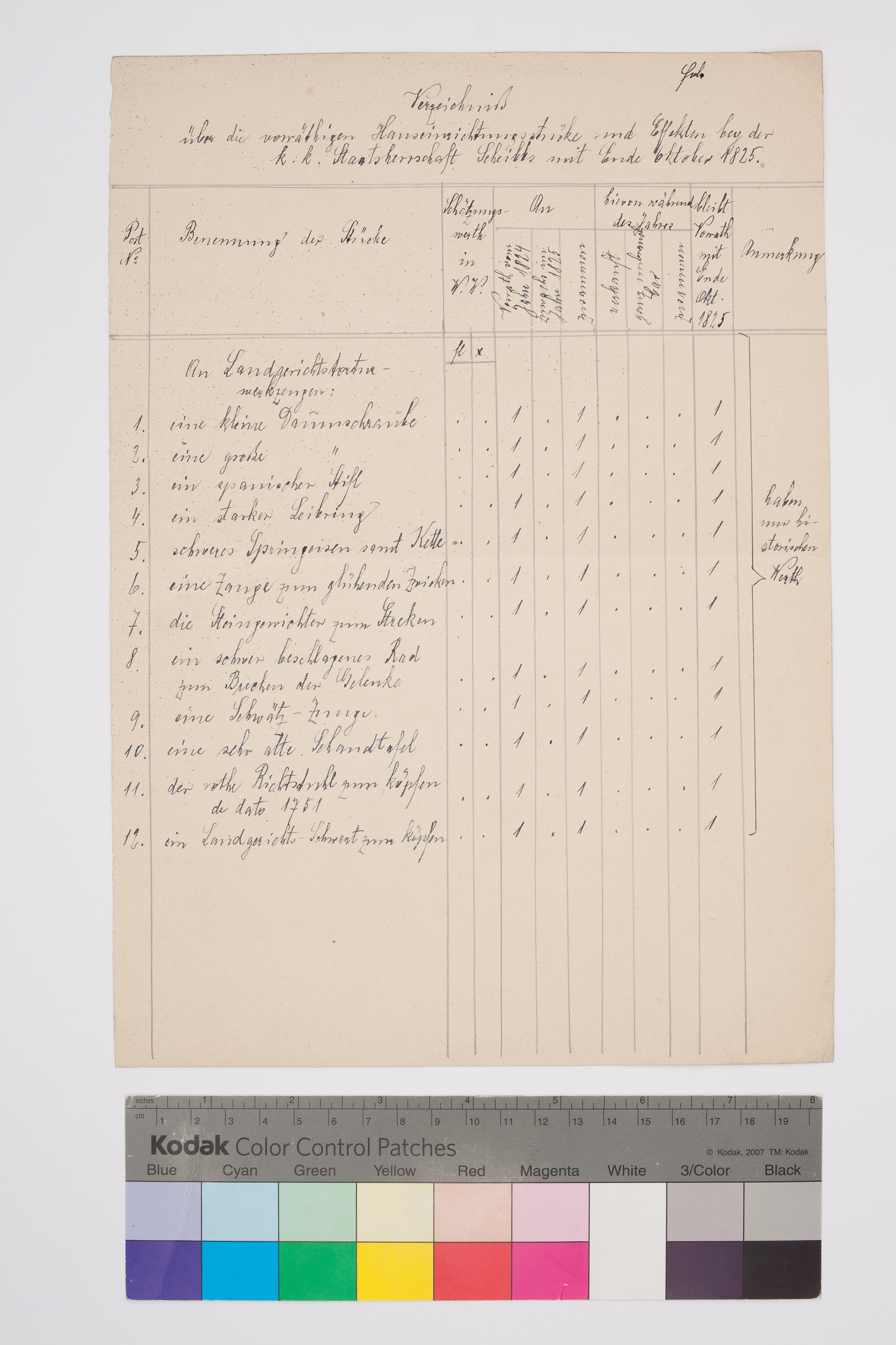 An Landgerichtstorturwerkzeugen werden 12 Postnummern angeführt mit dem Vermerk "haben nur historischen Wert."