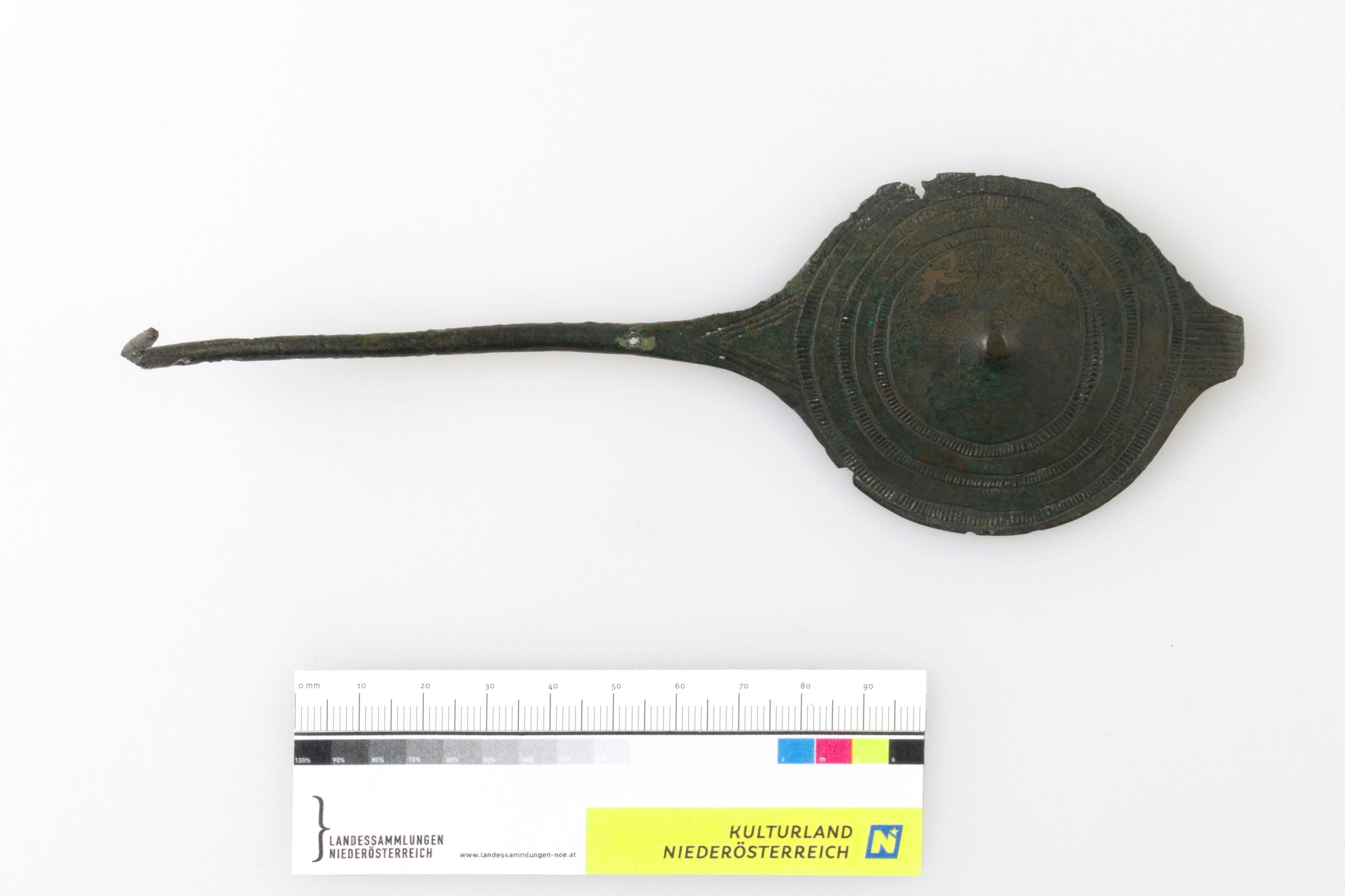 Scheibennadel aus Bronze mit Verzierung. Der Schaft ist an der Spitze säbelförmig gebogen und am oberen Teil mit einer kleinen Öffnung versehen. Der Schaft verbreitet sich zu einer großen kreisförmigen Kopfscheibe. Den oberen Abschluss bildet der leicht ausgezogene und nach hinten zu einer Rolle umgebogene Scheibenrand. Die Vorderseite des Scheibenkopfs weist eine Verzierung auf, die aus drei konzentrischen schraffierten Bändern besteht. Der Scheibenfortsatz weist parallele Schraffen auf. An der Ansatzstelle zwischen Scheibe und Nadel verlaufen zwei Bänder, die aus je drei eingeritzten Linien bestehen und vom äußeren Kreisband nadelwärts dreieckig zusammenlaufen. In der Scheibenmitte ist eine Buckelstruktur erkennbar. Die Rückseite des Objekts ist glatt. Insbesondere die Ziermuster sind eher grob ausgeführt.