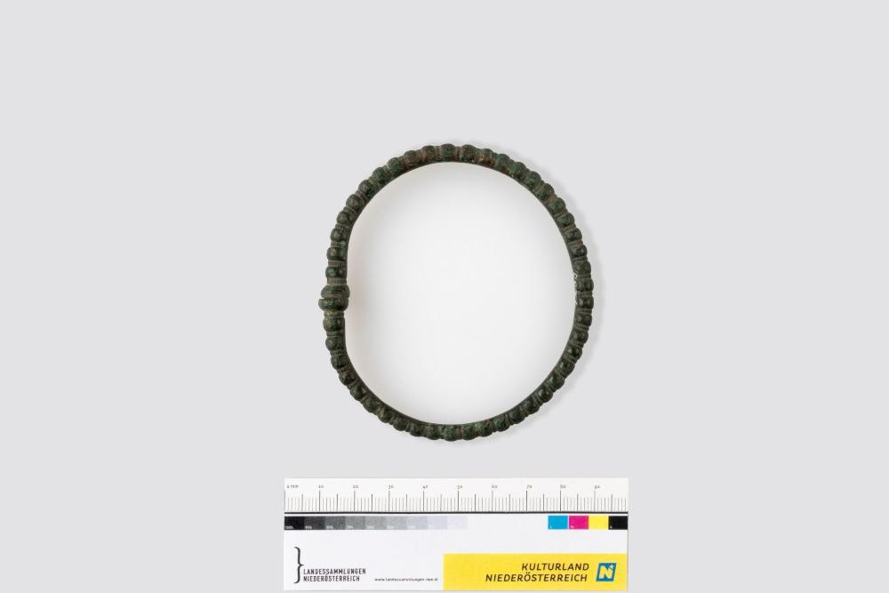 Einer von zwei annähernd identisch gestalteten Bronzereifen mit überlappenden, pufferartig verdickten Enden. Beide Ringe sind profiliert und besitzen einen ovalen Umriss sowie einen annähernd halbkreisförmigen Querschnitt. Die äußere Erscheinung der Objekte wird von einer Reihe runder Wülste mit Zwischenrippen geprägt. Die Innenseite der Ringe ist glatt.
