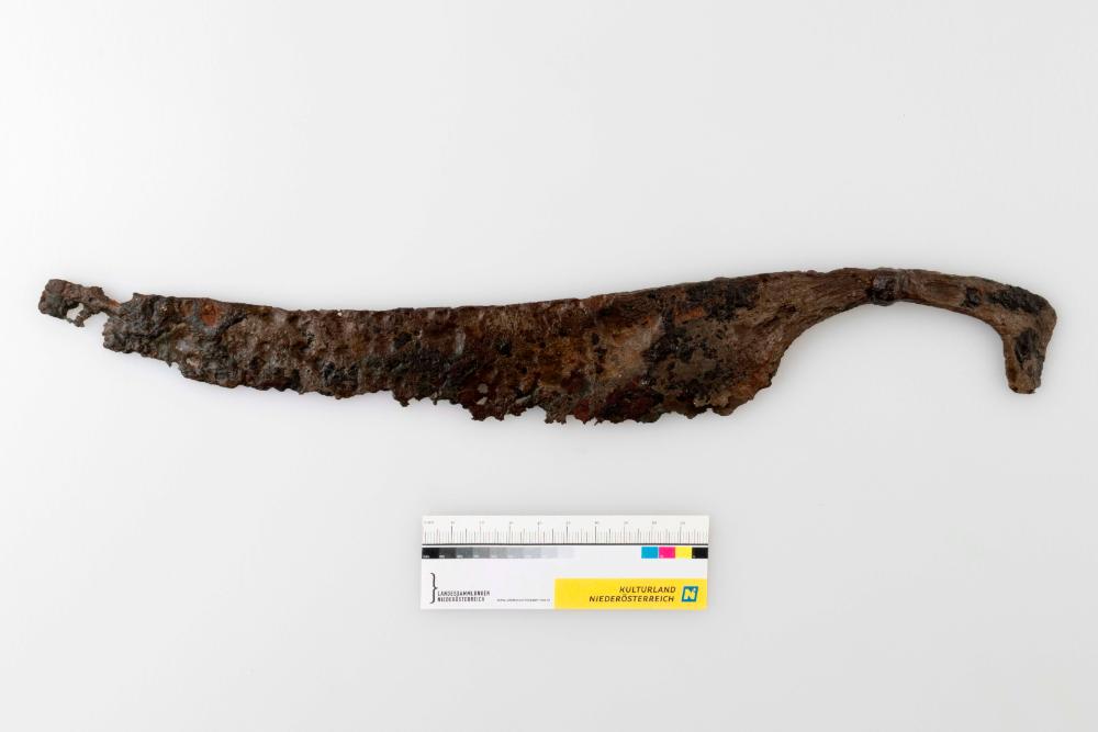 Ein großes Hiebmesser, das mit einem hakenförmigen Vollgriff und einem Griffknoten ausgestattet ist. Der Griff weist einen rechteckigen Querschnitt auf und ist im Zentrum mit einem Knoten versehen. Die Klinge zeichnet sich durch eine stark aufwärts gebogene Form aus.