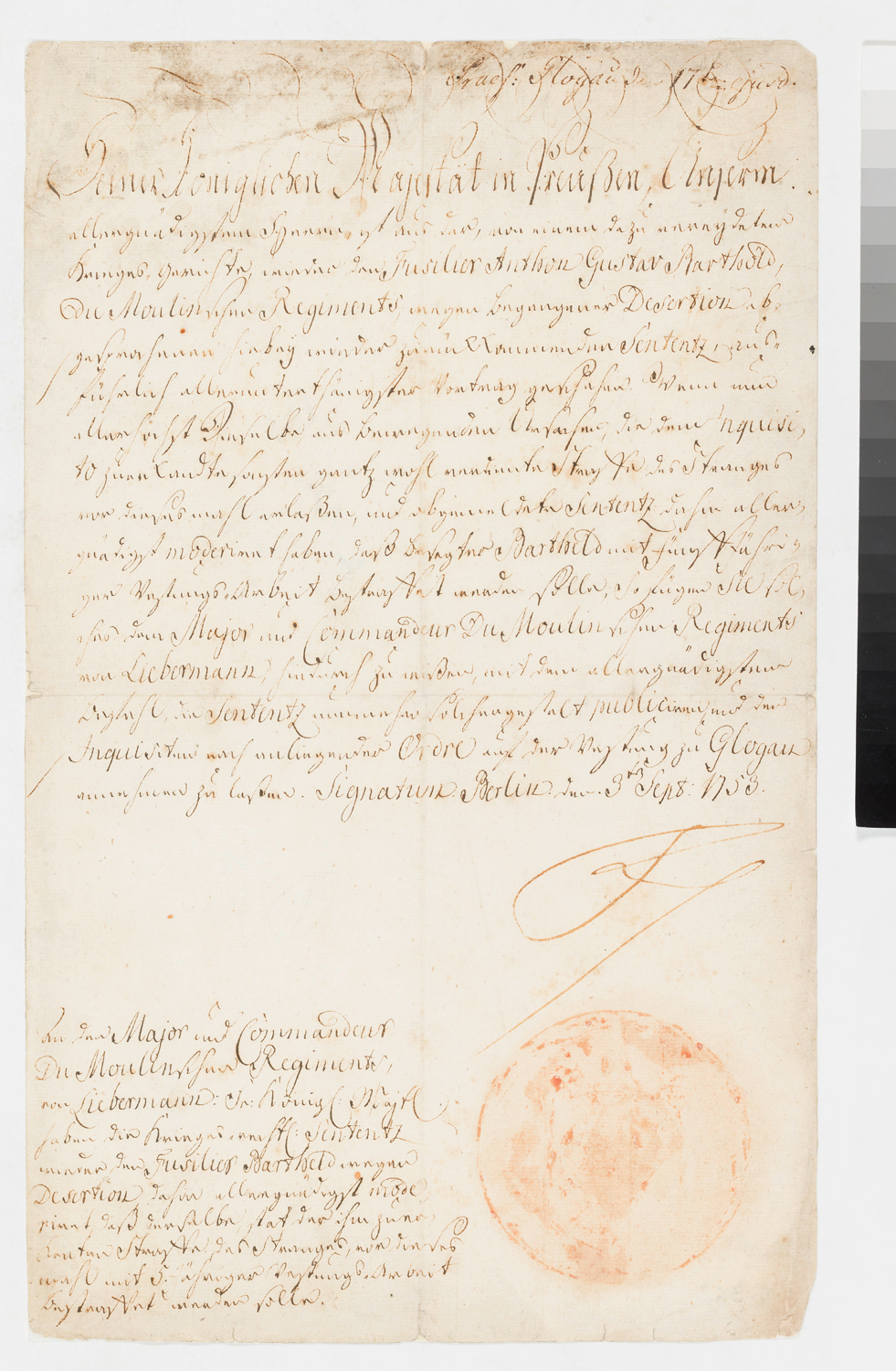 Der zum Tode verurteilte Füselier A. G. Barthold wird zur Festungshaft begnadigt. Originaleunterschrift König Friedrich II. von Preußen.