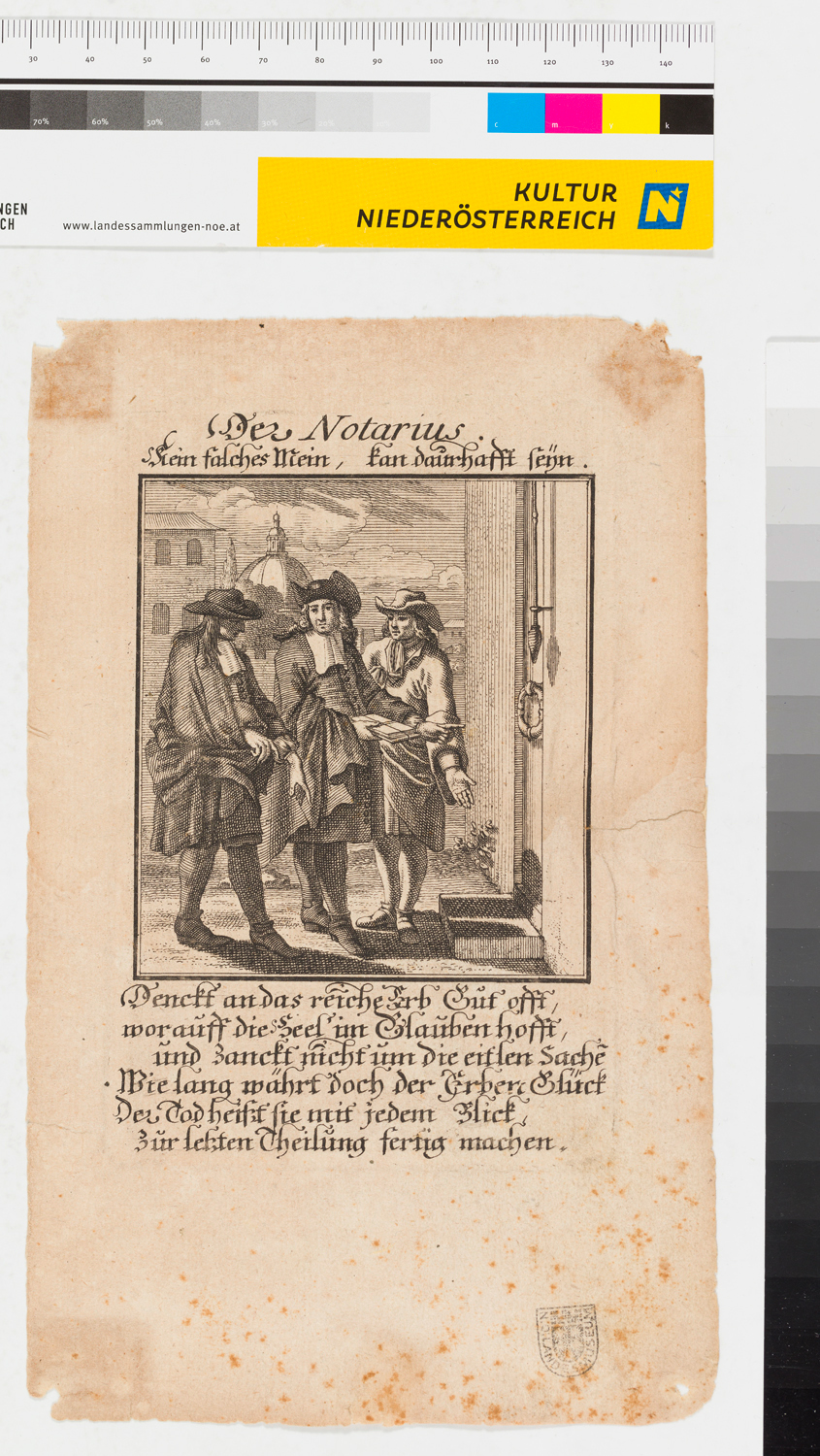 Kupferstich aus "Abraham a Sancta Clara" bzw. "Etwas für Alle, das ist: Eine kurtze Beschreibung allerley Stands-Ambts- Und Gewerbs Personen, Mit beygedruckter Sittlichen Lehre und Biblischen Concepten" (1699). Darunter sechs Verszeilen.
