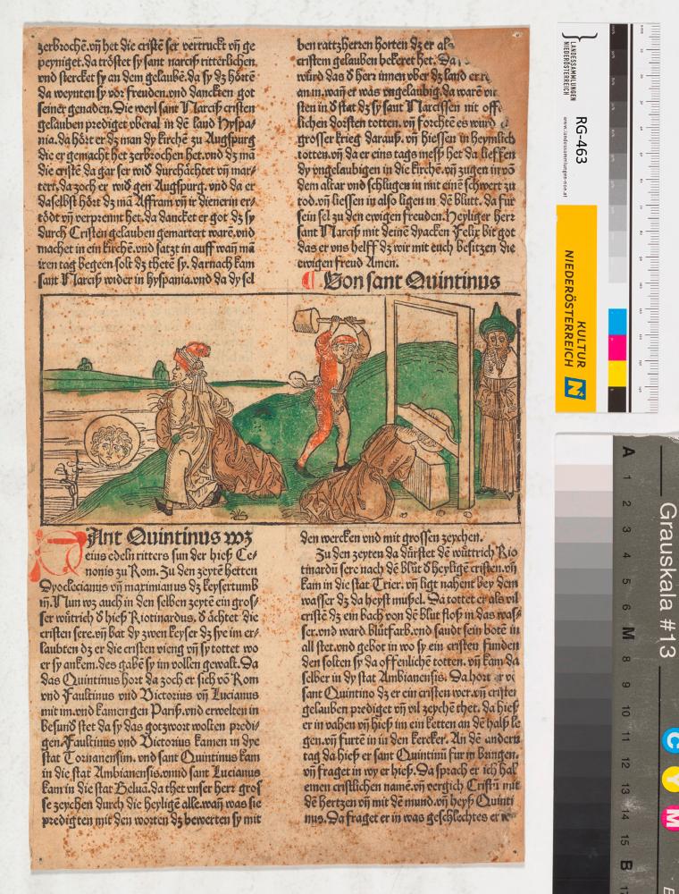 Der Holzschnitt zeigt die Enthauptung des heiligen Quintinus mit einer dem Fallbeil ähnlichen Maschine. In einem Holzrahmen bewegt sich ein Beil. Bei der Hinrichtung wird dieses am Hals des zu Köpfenden angesetzt und die Enthauptung durch Schlag mit einem Holzschlägl auf den Rücken des Beils vollzogen.