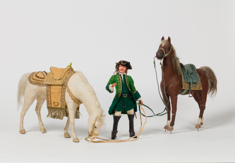 Jagdmeister mit schwarzem Dreispitz, braunen Haaren, grünem Justaucorps und Wams, weißem Hemd, Coulotten und Strümpfen, schwarzen Reitstiefeln und einem Jagddegen am Halfter, zwei Pferde an den Zügeln haltend.