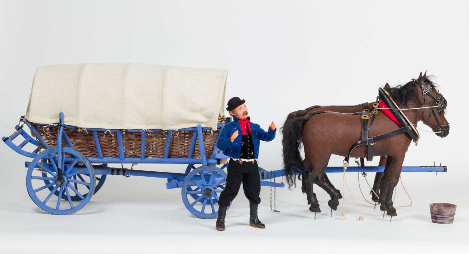 Zwei braune Zugpferde mit schwarzen Mähnen, Spitzkummete, Seletten mit Schweifriemen und Hintergeschirren, einen Planwagen ziehend. Planwagen mit blauem Gestell, Wagenkasten aus Rattangeflecht und Plane aus Leintuch über einem Eisengestell.