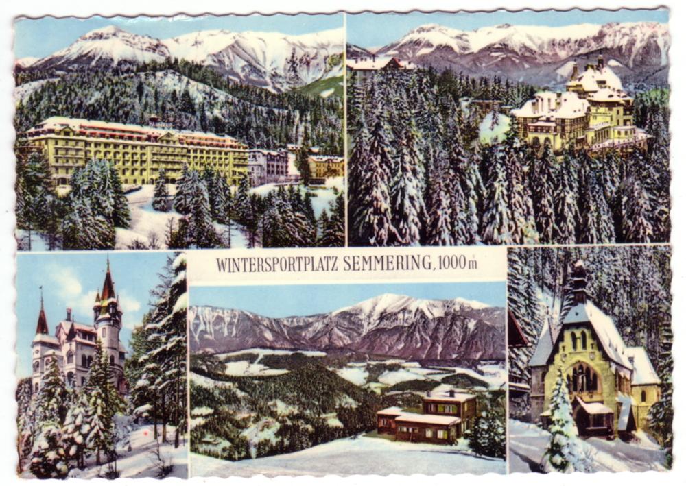 Fünf Wintermotive: Hotel Panhans, Südbahnhotel, Silbererschlößl, Liechtensteinhaus am Hirschenkogel, Kircherl am Hochweg.