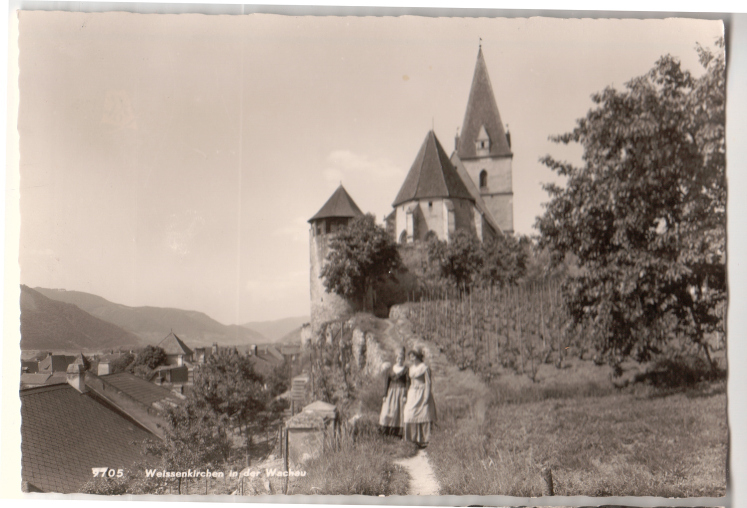 Ansicht der Kirche, im Bildvordergrund stehen zwei Frauen in Wachauer Trachten.