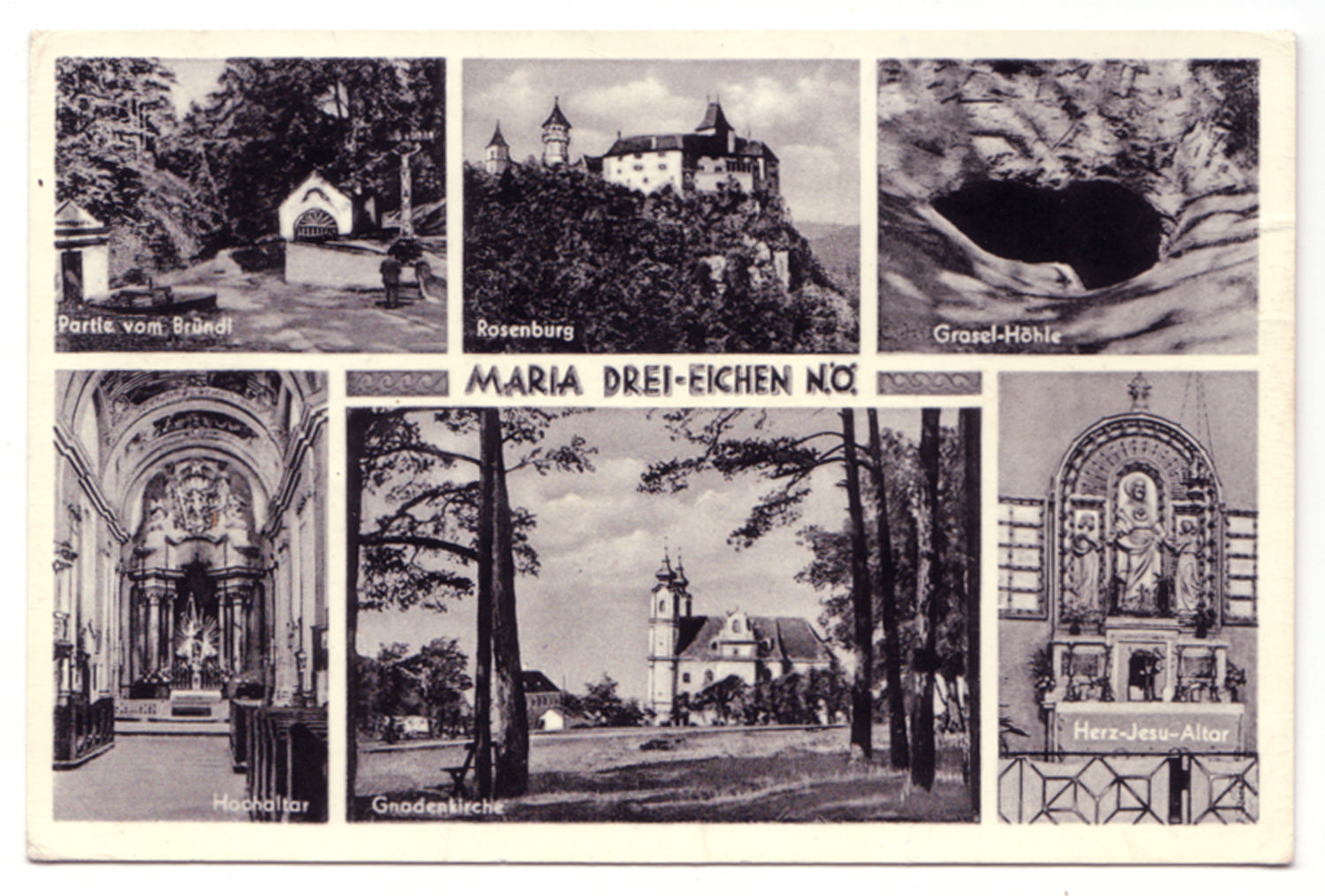 Sechs Motive: Partie vom Bründl, Rosenburg, Graselhöhle, Gnadenkirche, Hochaltar, HerzJesu-Altar. Beachte handschriftliche Anmerkungen auf der Rückseite der Karte.