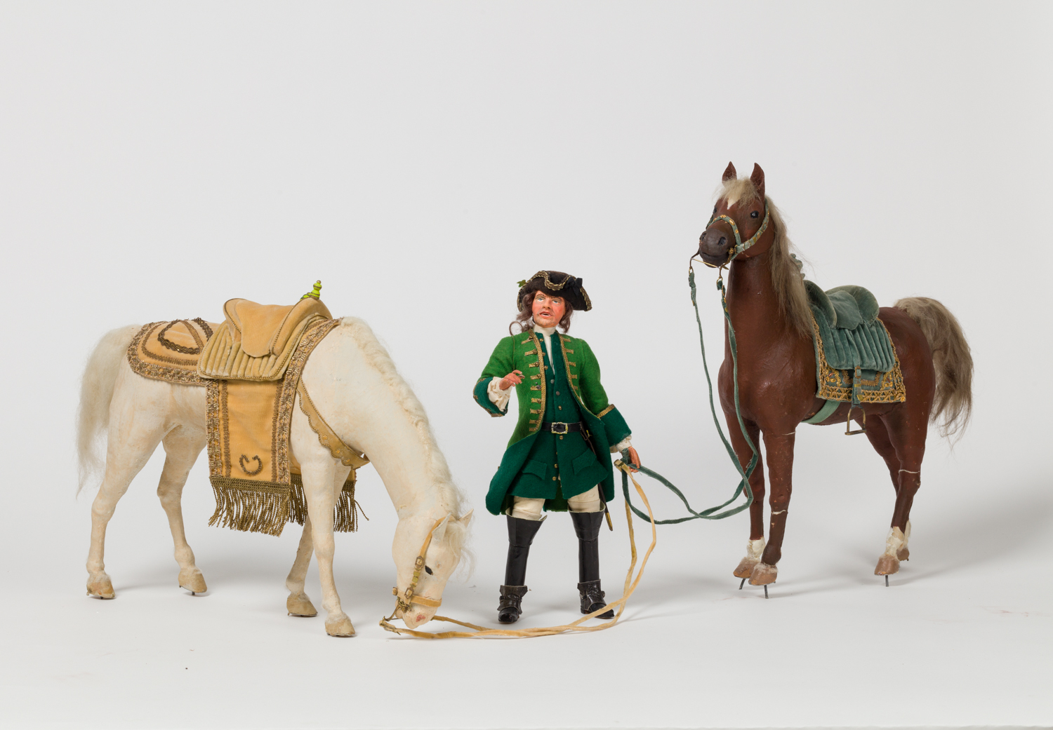 Jagdmeister, der die Pferde des Herrscherpaares bei den Zügeln hält.