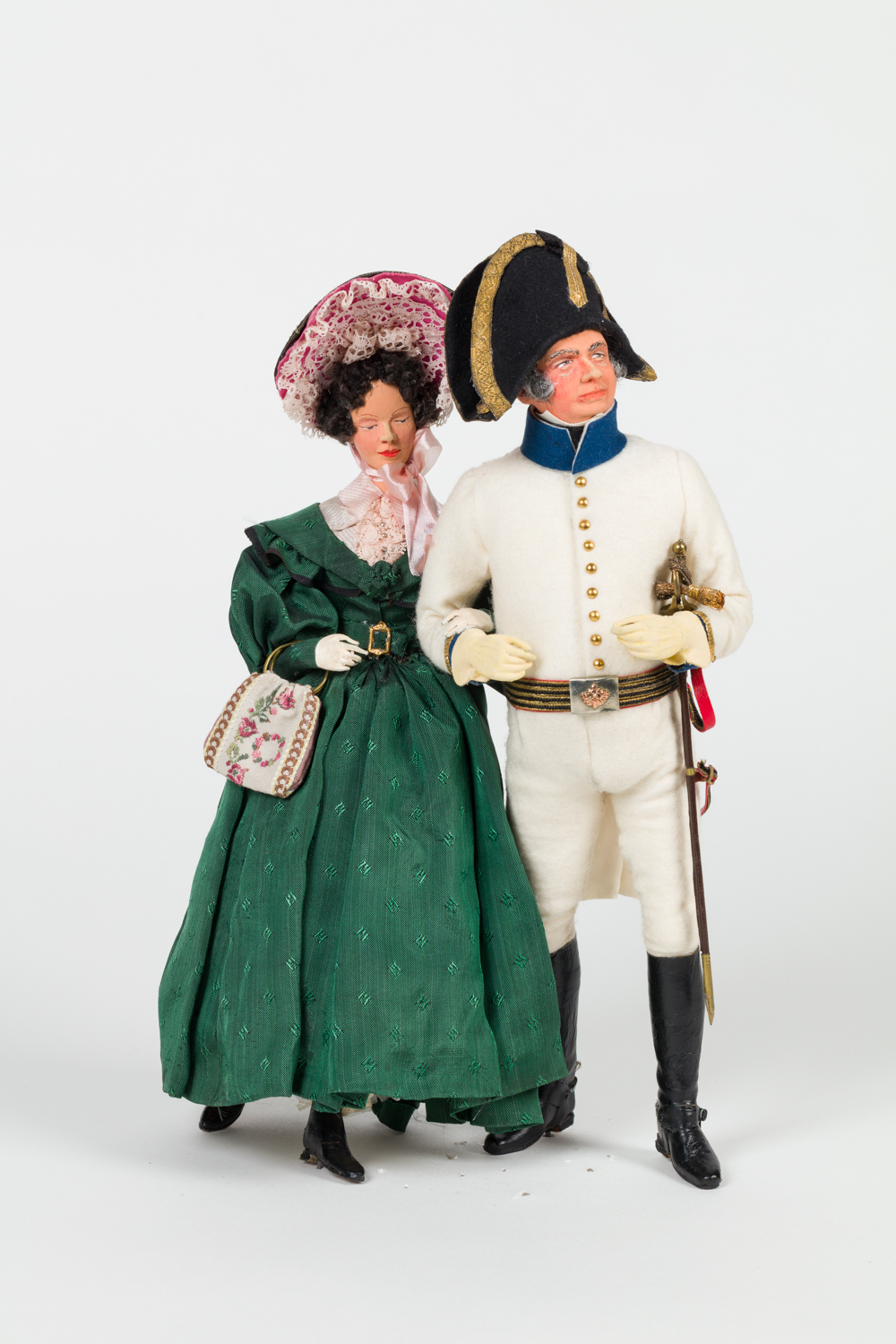 Offizier mit grauen Locken, schwarzem Zweispitz mit goldener Borte und Agraffe, weißer Monturrock mit blauem Kragen, goldenen Knöpfen und blau-goldenen Manschetten, rot gefüttertem, schwarz-goldenem Gürtel mit Doppeladler auf der silbernen Schnalle und geradem Paradedegen an schwarz-goldener Koppel, weißen Pantalons, weißen Handschuhen und schwarzen Stiefeln mit silbernen Sporen. Mit erhabener Geste geleitet er seine Gattin am Arm.