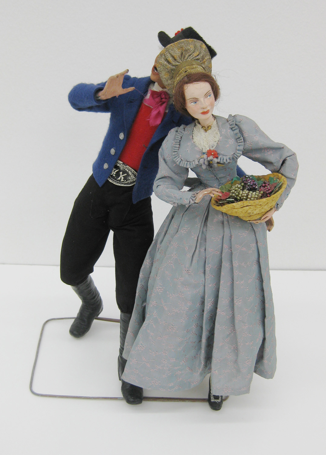 Frau mit blaugrauem Wachauerdirndl, Goldhaube und Korb; Mann mit blauer Jacke