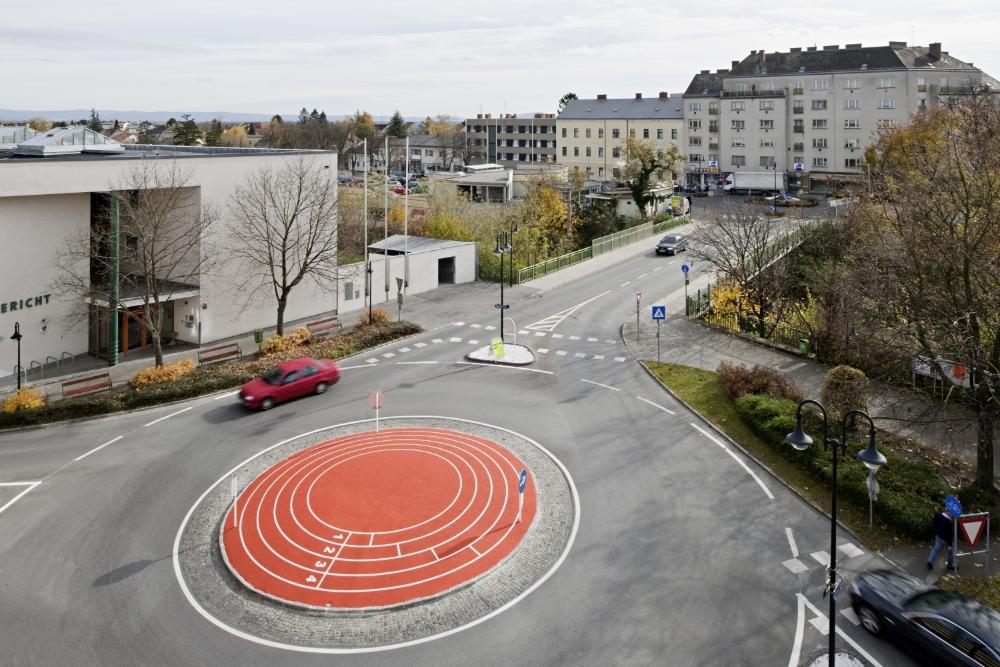 Mit dem für Sportanlagen üblichen Kunststoffbelag in oranger Farbe sind auf der Verkehrsinsel Volksbank-Platz vier Rennbahnen samt Start- und Ziellinien angelegt. Die Arbeit heißt nicht nur "Kreisverkehr", sie ist dessen wörtliche Auslegung, wenn sich kontinuierlich ausdehnende kreisförmige Linien von den Rennbahnen im Inneren in den Linien der Straßenmarkierung fortsetzen. Dem Platz bietet Ulrike Lienbacher damit ein integratives Element und vermeidet gezielt die übliche Abtrennung eines in der Mitte befindlichen Restraums vom umgebenden fließenden Verkehr. Durch eine Wölbung, die am höchsten Punkt eine Höhendifferenz zum Straßenniveau von 70 Zentimetern aufweist, ist der mittlere Bereich als skulpturaler Körper definiert und gibt durch seine zentrale Ausrichtung eine Bühne ab, die bei der Eröffnung von Vorführungen eines ortsansässigen Turnverein bestens angenommen wurde. Zusätzlich könnte man ihn aber auch als Plattform für Lienbachers eigene Arbeiten verstehen. Sowohl ihre Zeichnungen als auch Fotografien und Objekte greifen allgemein gültige Erfahrungen auf, die sich auf Sport, Leistung oder Disziplinierung beziehen. Hula-Hoop-Reifen, SportlerInnen und jugendliche TurnerInnen finden eine Projektionsfläche von Lienbachers Körperkonstruktionen in der überdimensionierten Scheibe, die selbst eine solche Konstruktion ist.