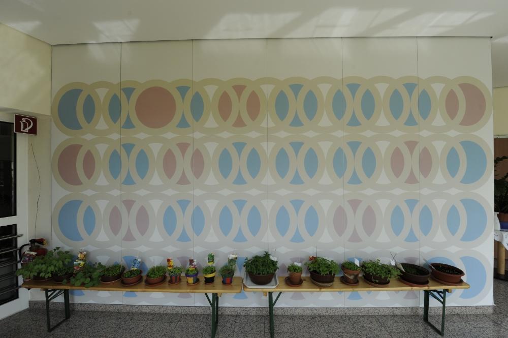 In Eggenburg verwendet der Künstler für die der Fensterfront gegenüberliegenden Wandabschnitte vier Reihen von beige gefaßten Kreisornamenten, die in einem bestimmten Rhythmus rot bzw. blau gefüllt sind. In einer konzeptuellen Haltung (und Berücksichtigung der jeweiligen Situation eines Ortes) betreibt er die Auflösung des Bildes: "…man versucht, sich in ein Detail zu retten, um das Bild noch zu finden…" (Walter Obholzer, Interview mit Silvia Eiblmayr).