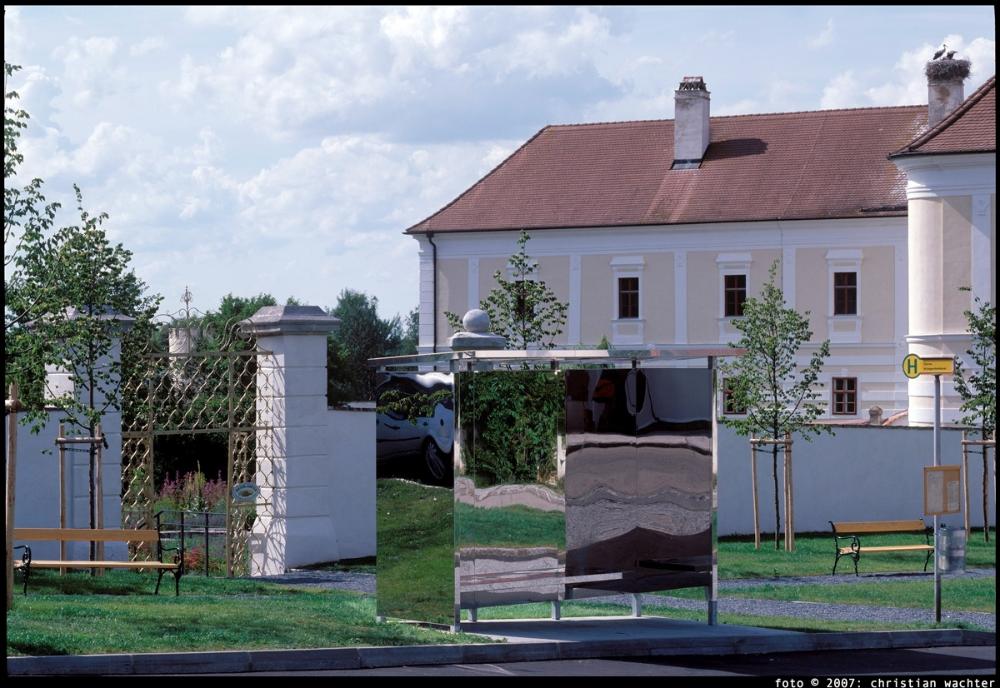 Das Projekt von Lisa Holzer für den kleinen Park vor dem Stift Geras besteht aus drei Teilen, die jeweils auf die bestehende Situation eines "verwünschten" Parks reagieren: ein Wartehaus aus spiegelndem Edelstahl, ein Brunnen in Form zarten Nebels und die Markierung des Tors zum Kräutergarten mit Goldfarbe. Das Hauptanliegen der Künstlerin war es, den Platz zu öffnen bzw. zu animieren und zu Interaktivität zwischen den künstlerischen Eingriffen und den Besucherinnen des Parks einzuladen. Für das Wartehäuschen wurde eine einfache kubische Struktur gewählt, die an drei Seiten mit hochpoliertem Edelstahl verkleidet ist. Lisa Holzer zaubert so ein sich ständig veränderndes Spiel von (Spiegel-)Bildern auf den Platz. Die Architektur tritt zurück und erhält die Funktion einer Bildproduktionsmaschine. Konterkariert wird das harte Material des Stahls durch den künstlichen Nebel, den die Künstlerin für den Brunnen gewählt hat. Das verdunstende Wasser erzeugt einen Schleier, der wiederum den dahinter liegenden Park in unserer Wahrnehmung verändert und immer wieder anders erscheinen lässt. Die Goldfarbe als Blickfang für das Tor zieht die Besucherinnen an, verschränkt es mit dem Gold des barocken Stiftes und führt weiter in den Garten. Wie in Mallarmés Gedicht "Nachmittag eines Fauns" erzeugt der gestaltete Park (Traum-)Bilder, welche die Projektionen der Besucherinnen abbilden.(Hemma Schmutz)