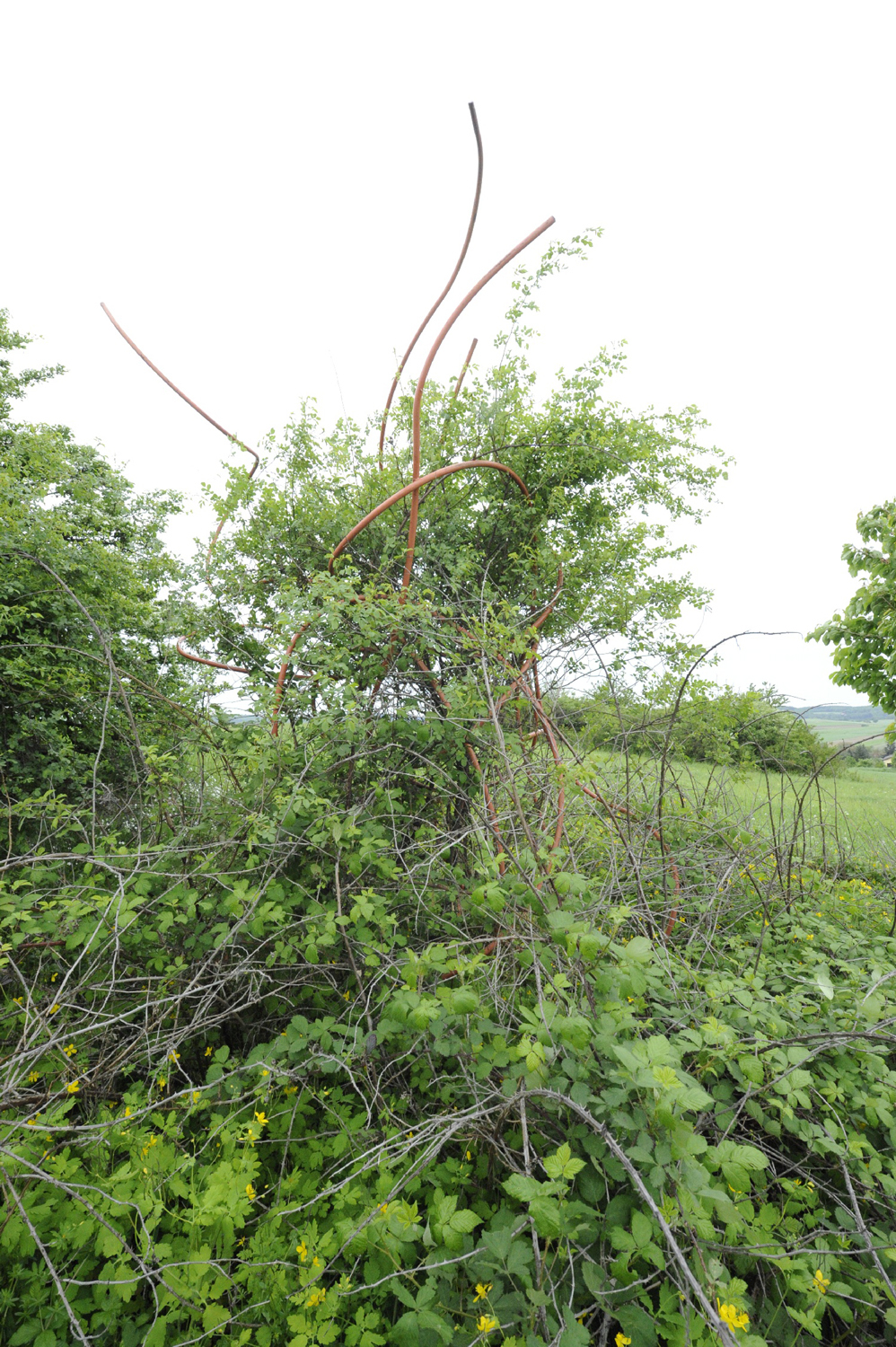 Anders als die mit mannigfaltigen narrativen und assoziativen Andeutungen operierenden frühen kleinformatigen "Kunst-Stücke" (Ausstellungstitel 1987) lebt die Eisenplastik "Verwicklung" von 1996 ganz aus dem abstrakten, eher musikalisch, tänzerisch als erzählerisch anmutenden Spiel der orangeroten Raumlinie. Lediglich die schlichte Materialität des industriell produzierten Rohmaterials erinnert noch an die frühen Objekte.