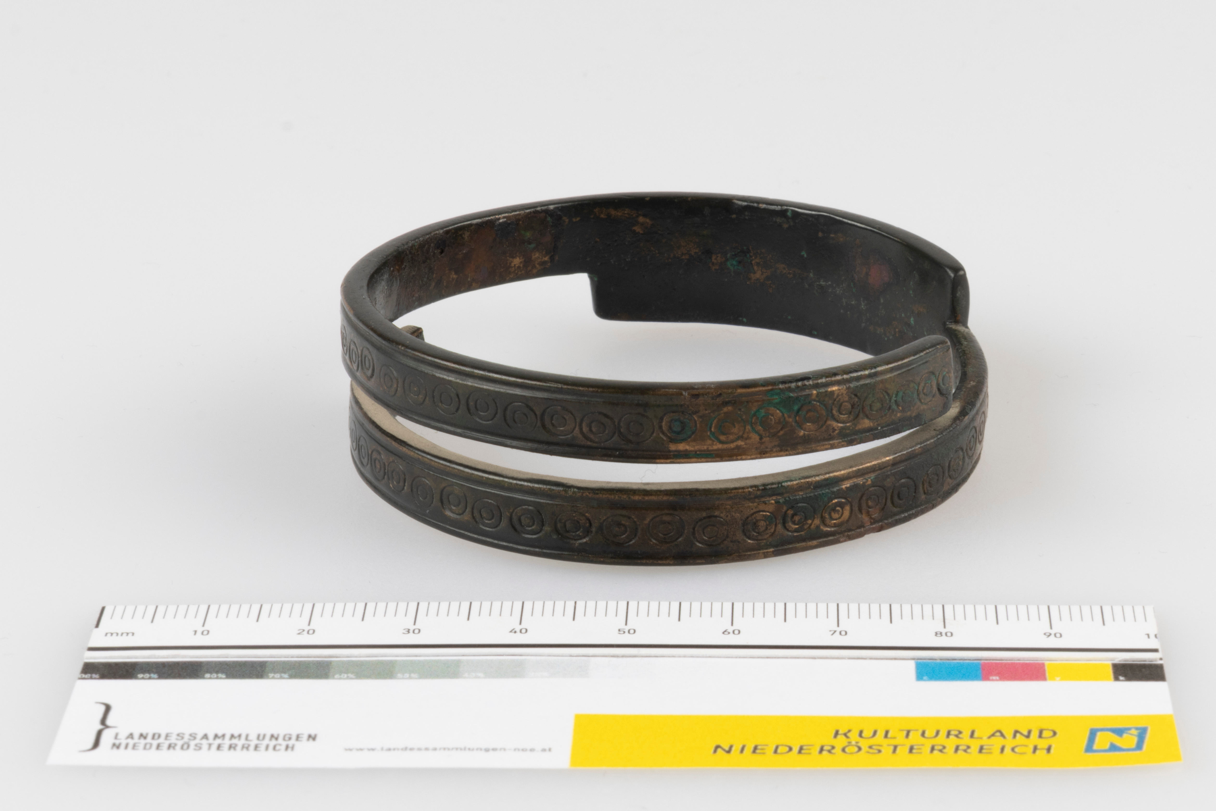 Doppelring aus zwei massiven, teils miteinander verbundenen Bronzebändern. Diese sind federnde Bänder, deren Enden sich teilweise überlappen. Die Oberfläche beider Bänder ist mit einer Verzierung aus einzelnen, entlang der Ränder verlaufenden Rillen versehen. Der Zwischenraum zwischen den Rillen ist mit in ungleichmäßigen Abständen aneinandergereihten, mit einer Punze eingeschlagene Würfelaugen gefüllt.