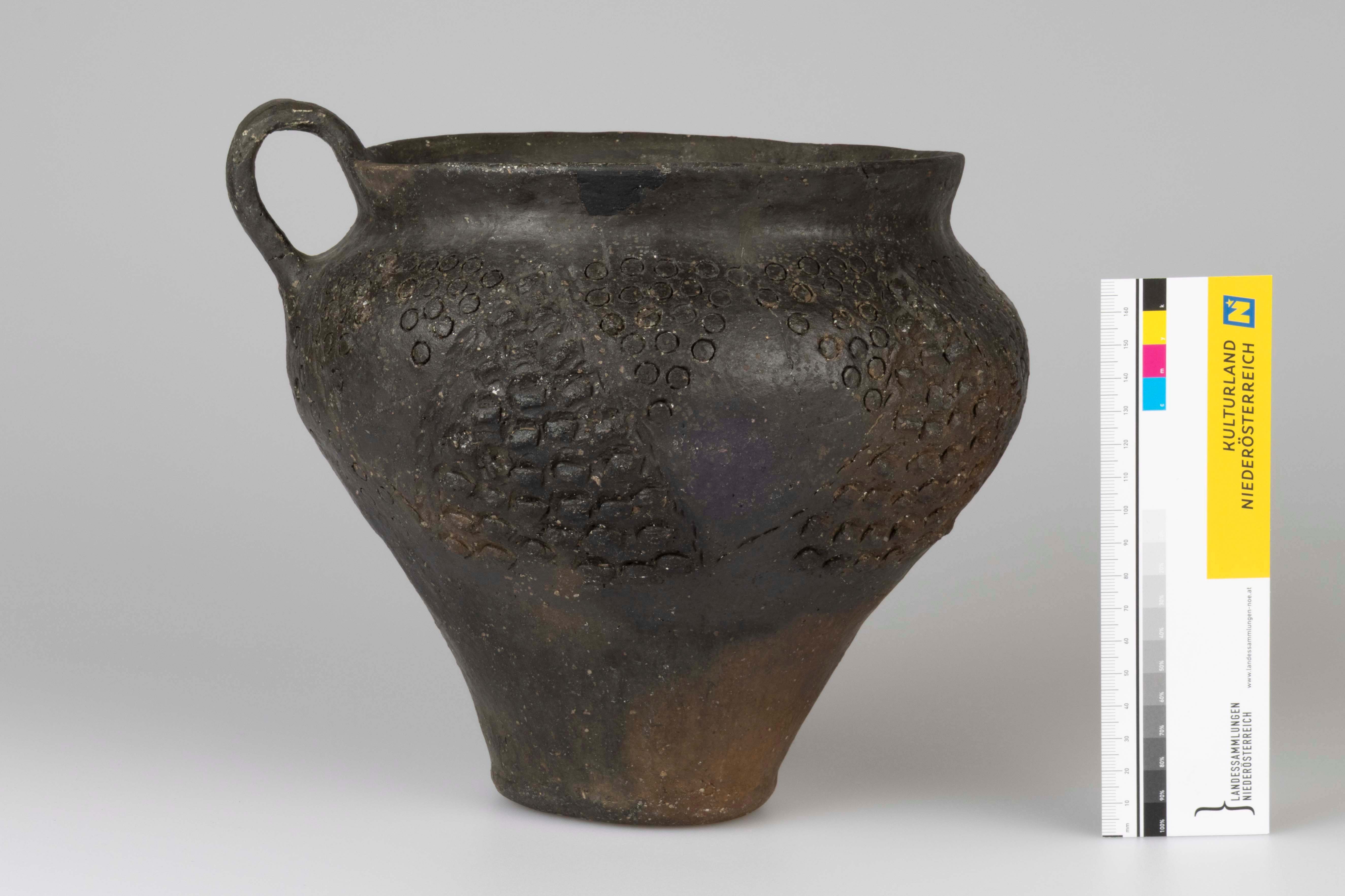 Der Henkeltopf zeichnet sich durch eine schlanke Form aus. Ein einseitig angebrachter Bandhenkel setzt an der Gefäßschulter und am Rand an. Die Gefäßoberfläche weist einen dunkelbraunen Farbton auf. Auf der Schulter befinden sich hängende Dreiecke aus runden Stempelabdrücken. Darunter, auf dem Bauch, befindet sich zwischen jedem zweiten dieser hängenden Dreiecke ein größeres stehendes Dreieck aus Fingernagelabdrücken.