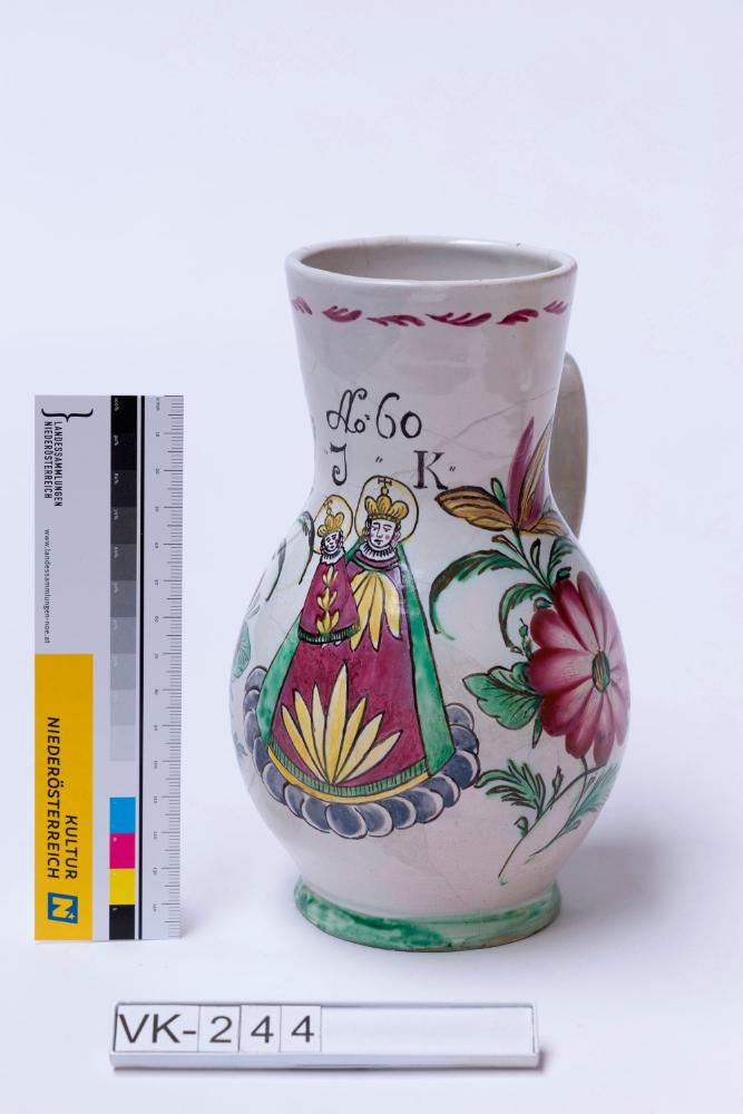 Bauchiger Majolika-Krug mit unterrandständigem Henkel und mehrfärbiger Bemalung: Wallfahrtsmadonna, zwei große Blütenmotive mit Blattwerk.