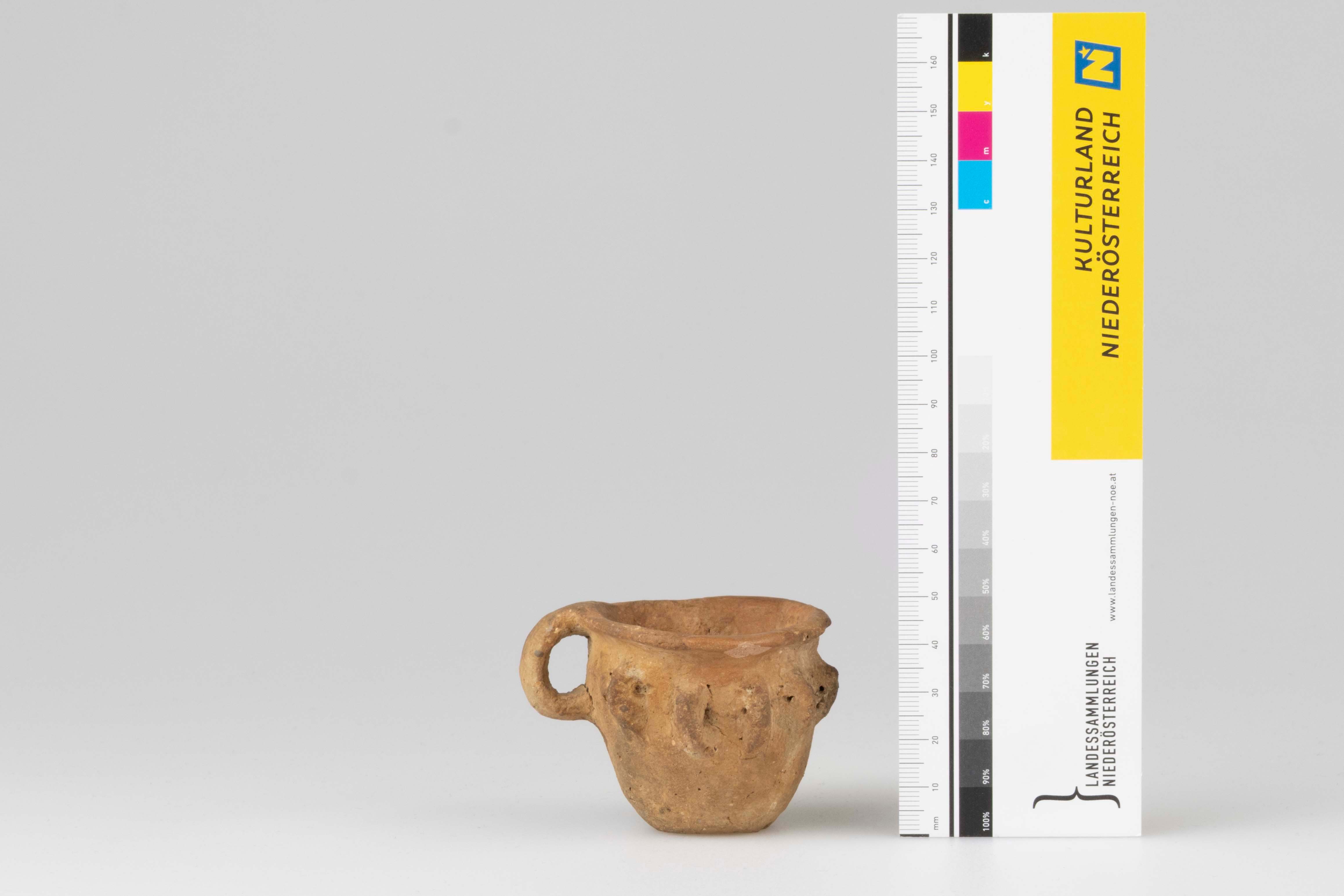 Ein Miniaturgefäß aus rötlichbraunem, oxidierend gebranntem Ton, der mit Steinchen und Sand gemagert wurde. Das Artefakt weist einen Bandhenkel und an der Schulter dicke, henkelartige Ösen auf, die als Höckerverzierungen bezeichnet werden.
