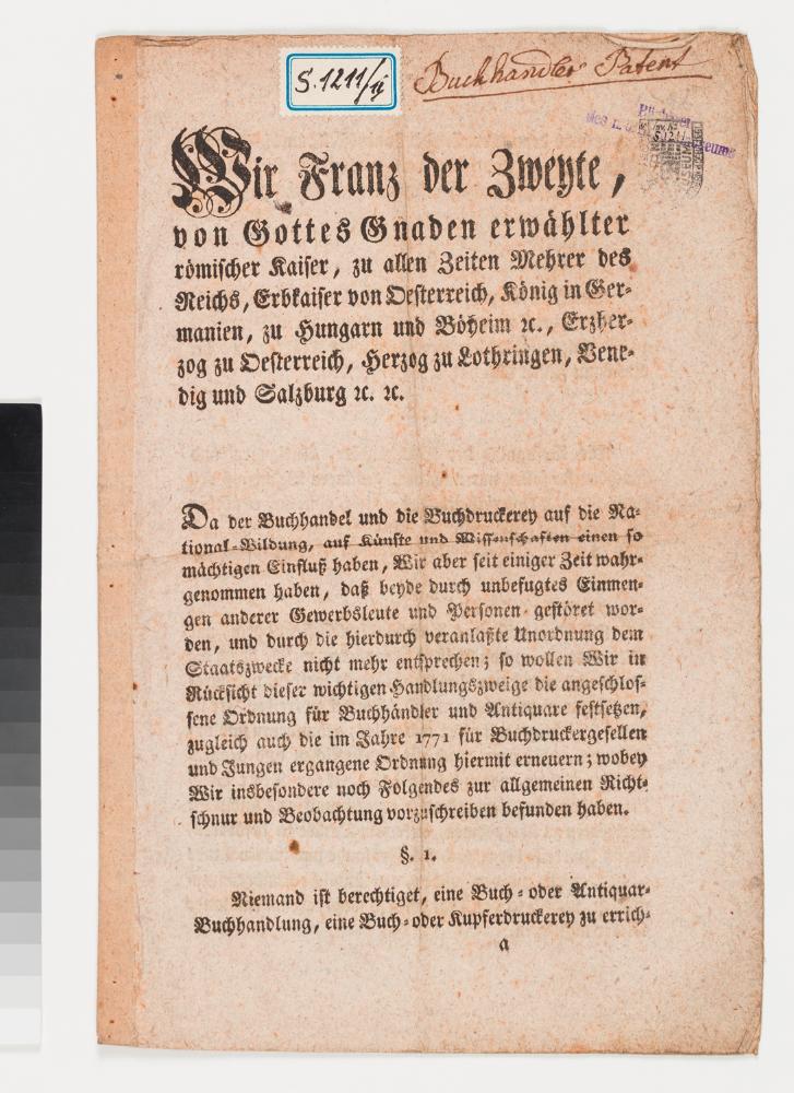 "Da der Buchhandel und die Buchdruckery auf die National=Bildung, auf Künste und Wissenschaften einen so mächtigen Einfluss haben, Wir aber seit einiger Zeit wahrgenommen haben, dass beyde durch unbefugtes Einmeengen anderer Gewerbsleute und Personen gestöret worden, und durch die hierdurch veranlasste Unordnung dem Staatszwecke nicht mehr entsprechen; so wollen wir in Rücksicht dieser wichtigen Handlunszweige die angeschlossene Ordnung für Buchhändler und Antiquare festsetzen [...]"