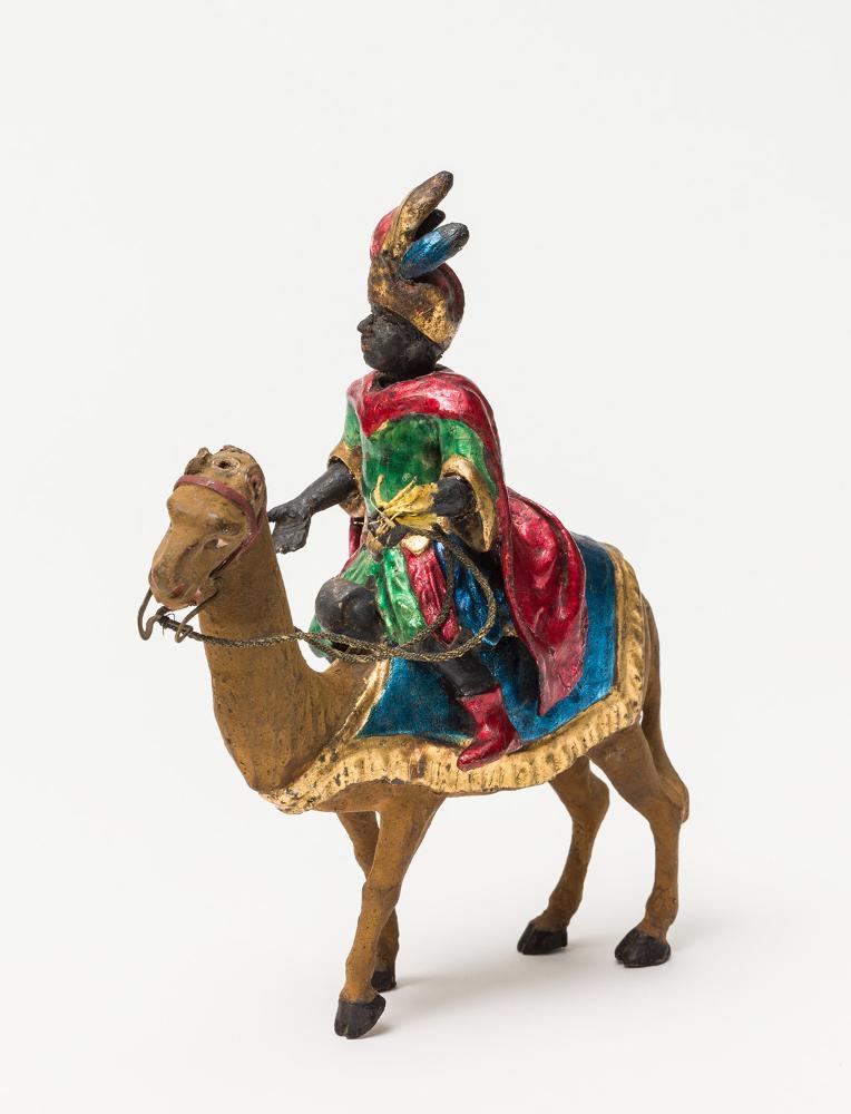 Reiterfigur (mit rotem Umhang und Turban auf einem Kamel mit blauer Decke). zweiteilig